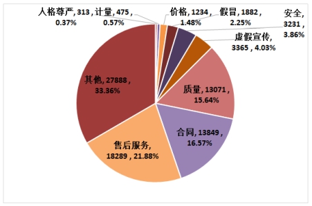 從投訴性質(zhì)看,2016年受理的投訴中,反映最突出的是售后服務(wù)問題,18289宗,占21.88%;其次是合同問題,13849宗,占16.57%;再就是質(zhì)量問題,13071宗,占15.64%;三大性質(zhì)類別的投訴比率都超過了10%。虛假宣傳問題、安全以及假冒問題,分別有3365宗、3231宗和1882宗,所占比率都低于5%。如圖3所示。