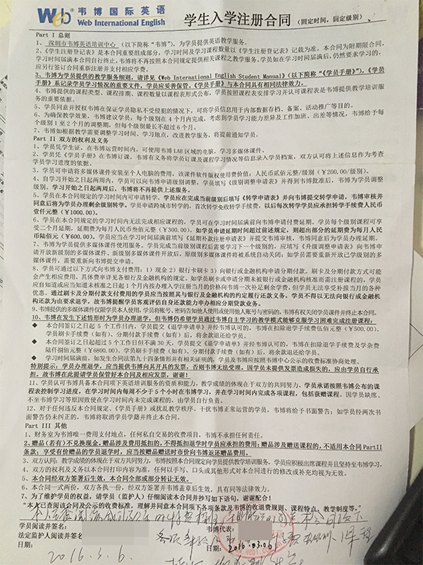 6節(jié)課,花費(fèi)34800元 投訴深圳市韋博國際英語培訓(xùn)中心單方合同條款,忽視消費(fèi)者權(quán)益。