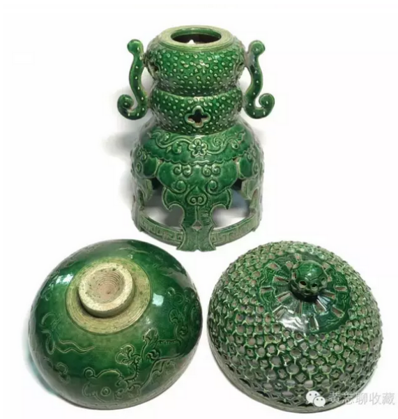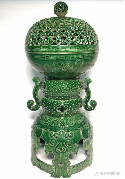 香薰在古代是頗為流行的室內陳設用器,形制多樣,材質不一。漢唐時期出土的香薰眾多,如有名的漢代博山爐,唐代香薰球等。兩宋時期,實行文人治國,香具更是盛行,影響所及,同時并存的遼、金兩朝也頗為風行。當然,香具中也區(qū)分宅舍用及寺廟用、宮殿用等。其中寺廟及宮殿用品多為成對擺放,講究對稱之美,顯得莊重大方。而宅舍之用更為推崇雅致,趣味。下面介紹的這件綠釉香薰應為遼金時期的寺廟用品。 香薰高31.5cm、直徑14.5cm,整體呈豆式。豆是先秦禮器,用以在祭祀、宴饗中盛放肉食。在家廟祭祀中,豆是不可或缺的禮儀用具,早期豆用竹編成,后用青銅鑄造,因此在禮書中稱“籩豆”。此對香薰延續(xù)了青銅豆的大體形制,上作球形,香盤半圓,蓋為鏤空半圓,扣合后渾然如一。香盤可拆卸,安插于支座上。座上部為雙扁圓狀疊壓,兩側裝飾螭龍耳;下部呈鏤空裙擺式,承以托泥,穩(wěn)重大方。通體施綠釉,釉面潤澤,純凈自然。器身點綴穿花龍紋,如意紋,加之裙擺上的龕形開光,推測為當時高等級的寺廟的佛前薰香供器。 欣賞更多藏品,歡迎瀏覽【黃志博物館】網站。 我們會介紹更多的收藏知識、推薦更多優(yōu)質優(yōu)價的藏品供您了解和選擇,也歡迎您把這些分享給朋友們,讓大家一起來了解歷史文化、體會收藏的快樂!
