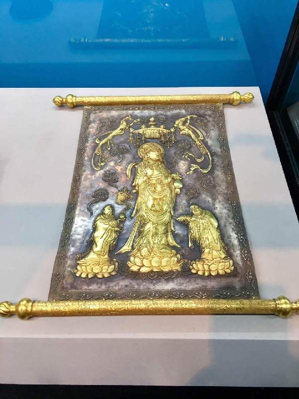 繼上個(gè)月舉辦的第一季“民國(guó)瓷畫展”,目前正在展覽的是第二季“佛像藝術(shù)展”。展出了遼金時(shí)期的銀鎏金佛塔、宋代泥塑描金的書卷觀音像、唐代捶揲銀鎏金“佛說(shuō)金色王經(jīng)”上下卷,還有南北朝時(shí)期的石雕彩漆描金思維菩薩像,這一期展出了29件展品。