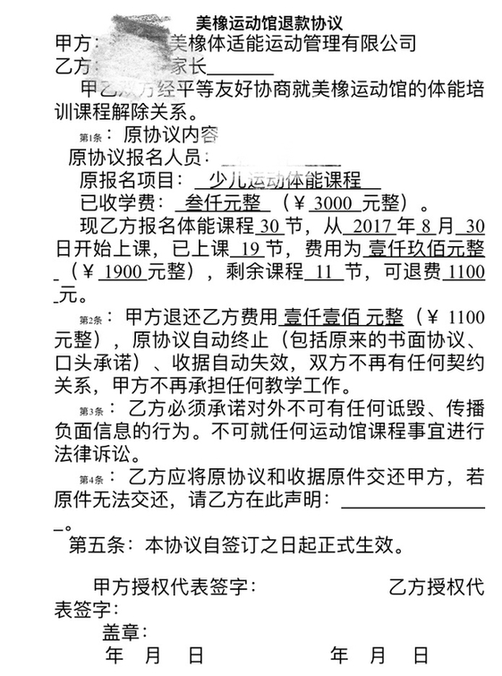 我于2017年8月30日續(xù)報(bào)深圳市美橡體適能運(yùn)動(dòng)管理有限公司體能課程,已經(jīng)是第三次報(bào)了,每次3000元,30節(jié)課,都是與教練微信溝通與轉(zhuǎn)帳。2018年1月10日收到該公司通知說結(jié)束體能館的業(yè)務(wù),不再營業(yè),說統(tǒng)一給我們退剩余的課程費(fèi)用,12號(hào)加了該公司財(cái)務(wù)微信溝通相關(guān)退費(fèi)事宜,財(cái)務(wù)說統(tǒng)計(jì)好在一周內(nèi)統(tǒng)一給我們退費(fèi),19號(hào)收到財(cái)務(wù)信息,說可以退回1100元,還說幾天后可以退款,并說好通過微信退還(當(dāng)時(shí)壓根沒有說簽協(xié)議后再退),一周拖一周,在23號(hào)忽然發(fā)微信來通知說要求去簽協(xié)議才退款,當(dāng)天又進(jìn)行了協(xié)商,因?yàn)槲規(guī)z小孩實(shí)在抽不出時(shí)間去他們公司,能否把協(xié)議發(fā)到我郵箱確認(rèn),財(cái)務(wù)說先與他老板匯報(bào)后第二天給回復(fù),但第二天也沒有收到任何回復(fù),然后又問財(cái)務(wù)協(xié)議發(fā)過來了嗎?財(cái)務(wù)二話沒說就把協(xié)議通過微信發(fā)給我,當(dāng)時(shí)想想簽了就算了,但細(xì)看第三、四條真的很難讓人接受,內(nèi)容詳見附件1。我們交費(fèi)的時(shí)候什么協(xié)議、收據(jù)對(duì)方都沒給,現(xiàn)在退錢就要求我們簽協(xié)議,而且是霸王條款,還叫我寫上“我自愿終止培訓(xùn)課程”,老天哪是我自愿的,真是有種迫良為猖的感覺,還有第三條,也太污辱人格了,再次和他們友好協(xié)商希望把協(xié)議第三條改了,對(duì)方視而不見,不理不睬,也不積極回應(yīng)。