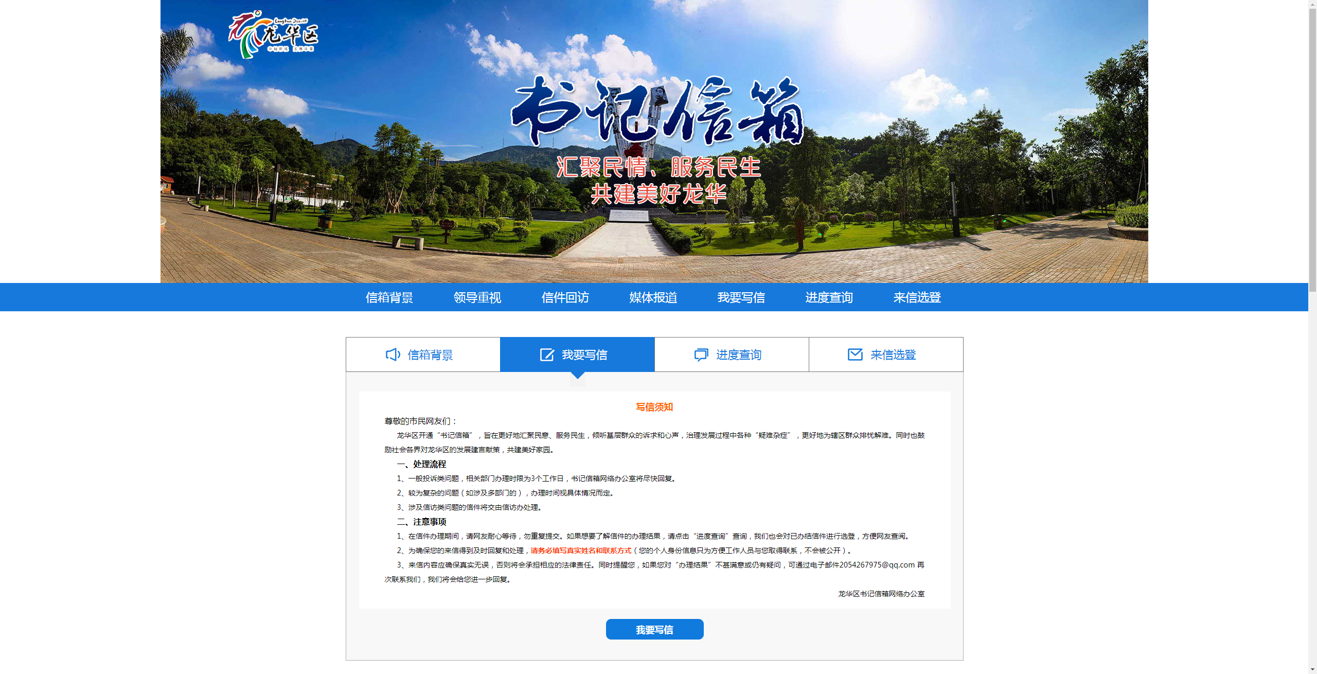 龍華區(qū)“書記信箱”網(wǎng)絡(luò)平臺是由龍華區(qū)領(lǐng)導(dǎo)的指導(dǎo)下搭建的網(wǎng)絡(luò)信息平臺,由深圳新聞網(wǎng)團隊進行開發(fā)搭建。“書記信箱”的構(gòu)建,是龍華區(qū)委貫徹落實黨的群眾路線,踐行“三嚴(yán)三實”的一項新舉措?!皶浶畔洹弊?015年10月31日正式上線以來,逐步成為龍華市民向龍華區(qū)委反映、提出建議、意見和投訴請求的重要渠道。
