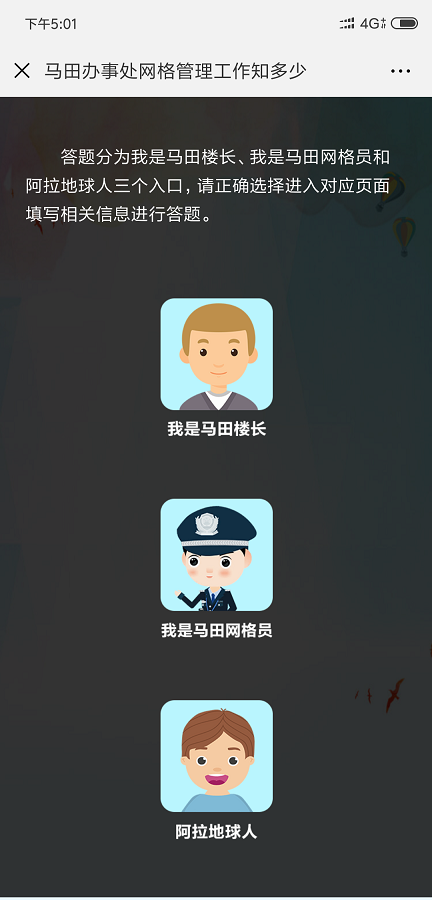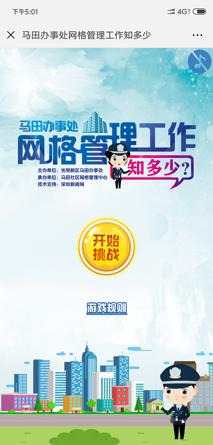 隨著當(dāng)前光明新區(qū)經(jīng)濟(jì)和社會的飛速發(fā)展,網(wǎng)格巡查管理工作環(huán)境日趨復(fù)雜。為此,馬田辦事處以社區(qū)網(wǎng)格化為抓手,積極帶領(lǐng)業(yè)主、樓長、住戶主動參與到樓棟的管理和社區(qū)的建設(shè),使他們從小“家”邁向大“家”,家家參與、人人行動,讓安全文明新風(fēng)形成常態(tài),營造生機(jī)勃勃、欣欣向榮的社會氛圍,在馬田轄區(qū)打造共建共治共享社會治理格局。“馬田辦事處網(wǎng)格管理工作知多少”線上有獎競答活動,由光明新區(qū)馬田辦事處主辦,馬田社區(qū)網(wǎng)格管理中心承辦。此次答題活動自8月15日9點啟動,截止至8月19日23點59分,為期5天。答題分為“我是網(wǎng)格員”入口、“我是樓長”入口和“阿拉地球人”三個入口。通過樓長入口進(jìn)入的用戶,需輸入馬田轄區(qū)樓長身份證或港澳通行證號方可答題,網(wǎng)格員入口則需輸入馬田轄區(qū)網(wǎng)格員有效證件號碼進(jìn)入對應(yīng)的答題頁面。在每次答題時,答題系統(tǒng)將隨機(jī)抽取10道題,用戶須在120秒的時間內(nèi)完成,答對8題以上即視為闖關(guān)成功,可獲得一次抽獎機(jī)會,有機(jī)會獲得100元、50元、10元、5元、2元不等的微信紅包。
