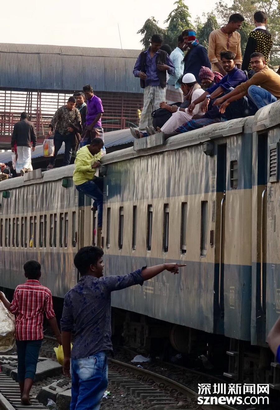 從達(dá)卡到邁門辛的火車是國內(nèi)最擁擠的線路之一,通常有數(shù)千名旅客擠在載客人數(shù)只有650人的火車?yán)?,有的抓著把手,有的蹲在門口,要不就蹲在車箱間的聯(lián)軸上或坐在車頂上。李仁奇攝