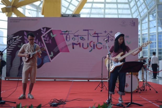 畢業(yè)于深圳大學金鐘音樂學院的主唱周鈺城帶來兩首尤克里里樂隊歌曲, Jason Mraz 的經(jīng)典曲目《 I’ m Yours 》和英國當紅歌星 E d sheeran 的 《 Thinking out Loud 》,周鈺城富有磁性的嗓音,在深圳夏威夷小吉他協(xié)會理事謝佳宜的尤克里里琴聲以及同樣畢業(yè)于深圳大學金鐘音樂學院的鼓手黃曉輝的鼓聲伴奏中,美妙的融合在一起。