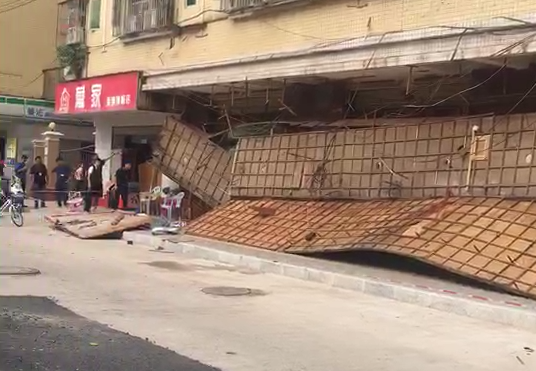 從市民拍攝的視頻可看到,掉落招牌掉落面積較大,橫跨多個門面,現(xiàn)場一片狼藉。(問政帖文:《觀瀾東升小區(qū)附近網(wǎng)吧招牌掉了,里面困了好多人》)