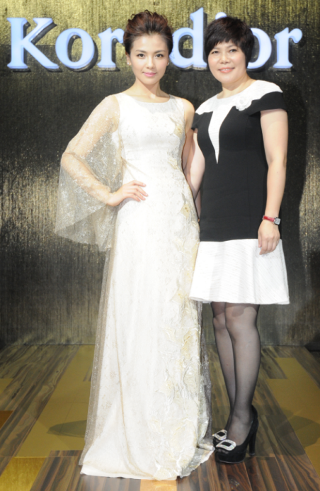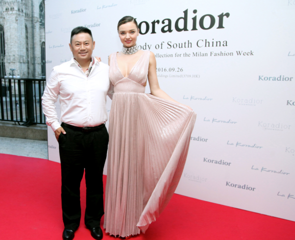 現(xiàn)任贏家時(shí)尚控股有限公司董事局主席金明先生和米蘭達(dá)可兒在2017年米蘭時(shí)裝周Koradior發(fā)布秀背景板合影