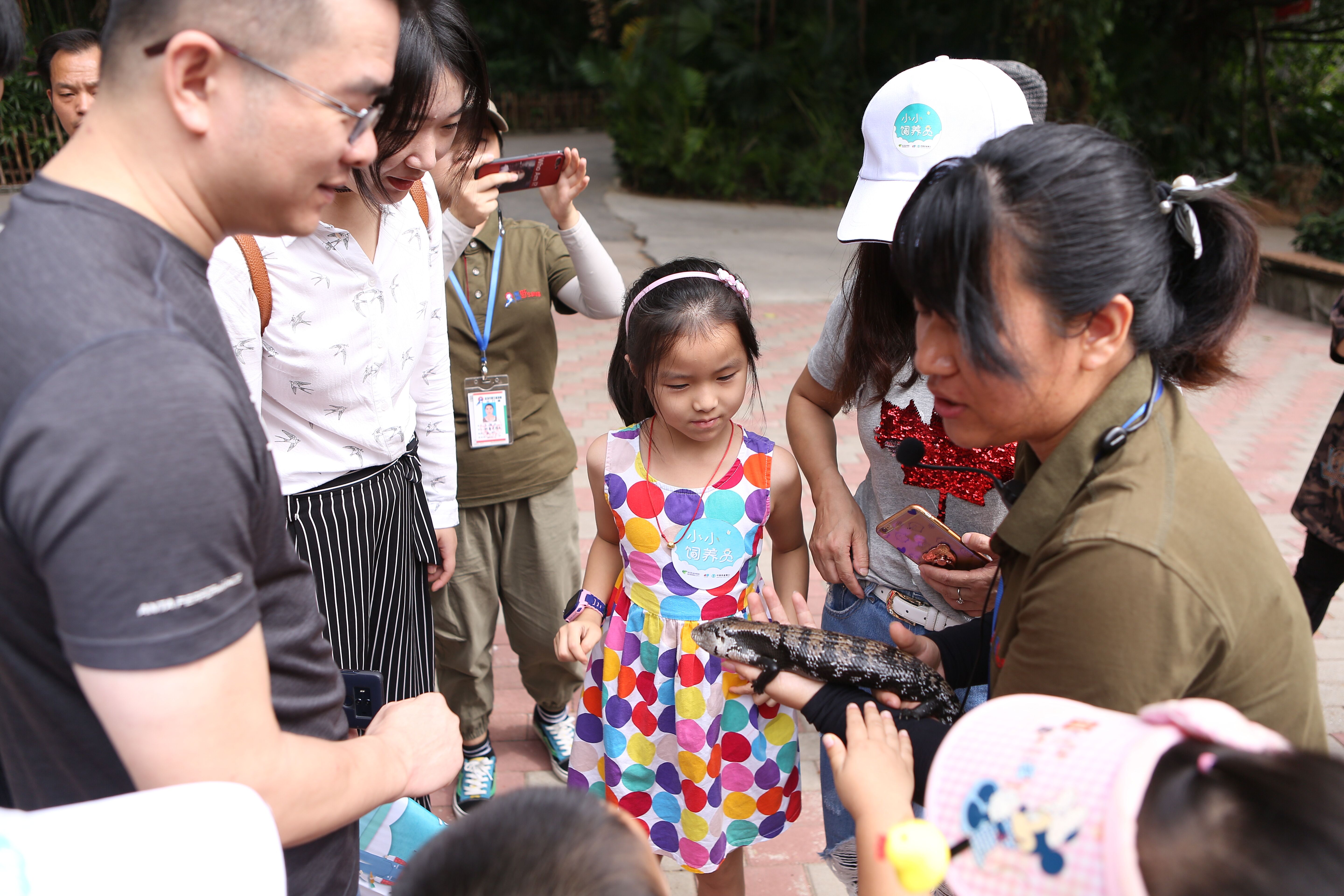 “鬃獅蜥和藍(lán)舌石龍子都是蜥蜴的一種。當(dāng)遭受威脅時(shí),鬃獅蜥會(huì)張開(kāi)嘴及將帶刺的咽喉膨起來(lái)像一頭生氣的獅子。藍(lán)舌石龍子的舌頭是藍(lán)色的,平時(shí)會(huì)不時(shí)向外一伸一伸。”小朋友們認(rèn)真地聽(tīng)科普導(dǎo)游講解兩種蜥蜴的區(qū)別,膽大的孩子則抱起蜥蜴仔細(xì)觀察起來(lái)。