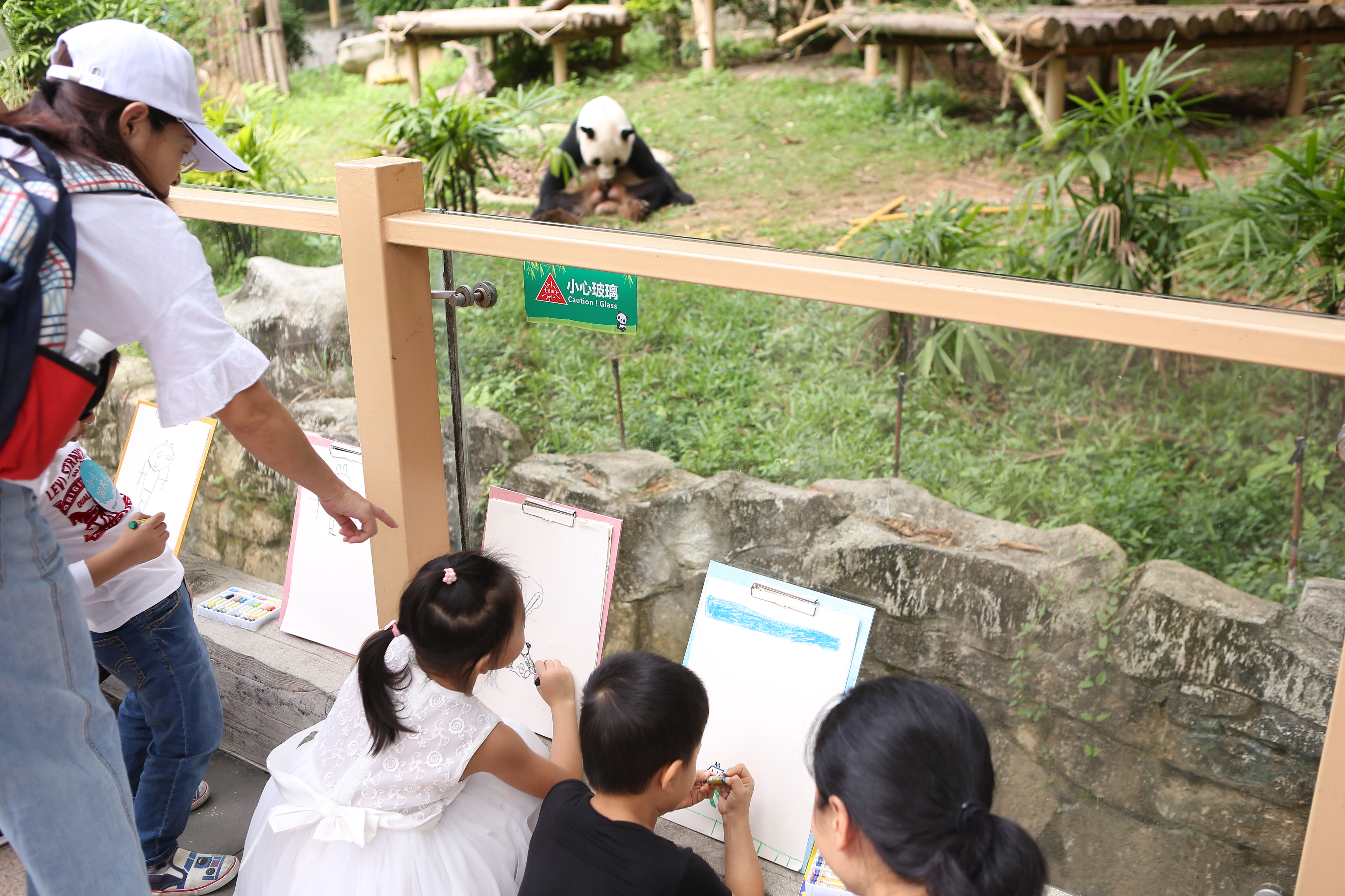 猿猴村的后面,是國(guó)寶大熊貓的家——熊貓莊園。小朋友們來(lái)到這里,瞬間被大熊貓圓滾滾的萌態(tài)所吸引。他們或坐或站,拿起畫(huà)板,完成了從“小飼養(yǎng)員”到“小畫(huà)家”的角色轉(zhuǎn)變。在認(rèn)真觀察大熊貓后,小朋友們揮動(dòng)手中的畫(huà)筆,將它們的萌態(tài)一一呈現(xiàn)在畫(huà)板上。