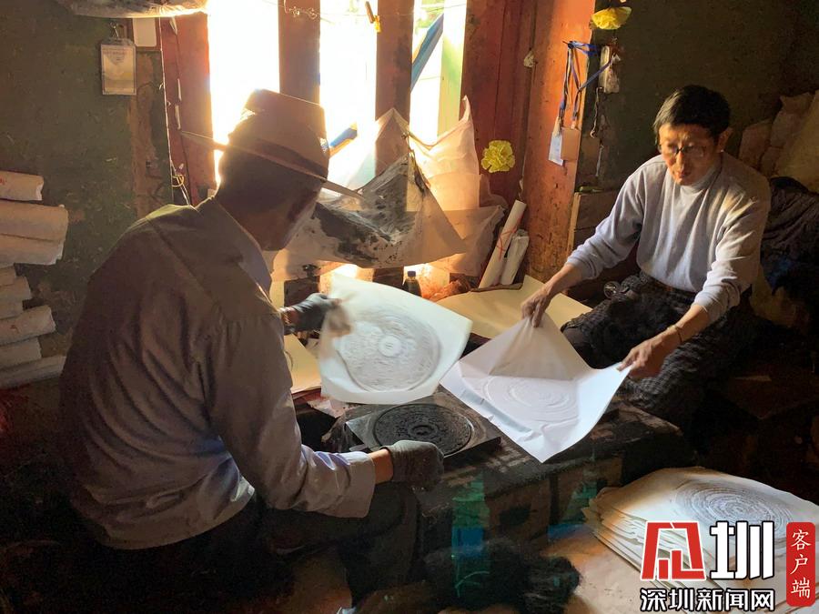 高坐的人負責接紙并準確固定印版與印紙之間的一拓面,以及在印版上滾墨,矮坐的人則一邊遞紙,一邊持卷布干滾筒,自上而下雙手推過,迅速揚起已印的書頁放置一旁,如此周而復始。李仁奇攝
