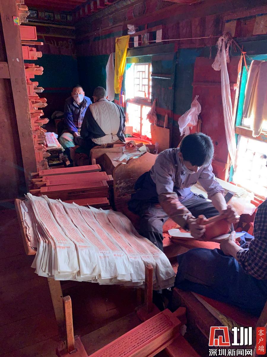 德格印經院的印刷工藝大體可分裁紙、顏料加工、印刷、裝訂四個流程。又可細分裁紙、泡紙、兌墨、研磨、兌制朱砂、取版、印刷、晾曬、洗版、歸庫、分頁、核對、裝訂、打磨、刷色邊、包裝等十余道工序。李仁奇攝