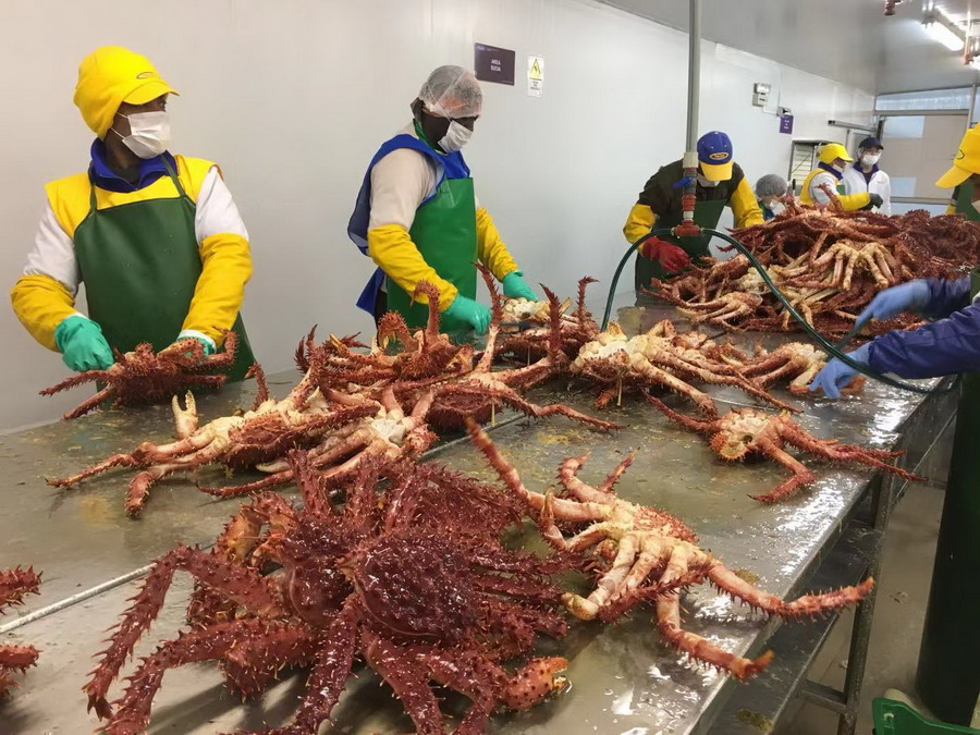 據(jù)介紹,蜘蛛蟹是用一種鐵籠子放入深海誘捕的,智利政府規(guī)定,小于1.5公斤的不許捕撈,因此,鐵籠的孔隙會放走幼小的蜘蛛蟹。李仁奇攝