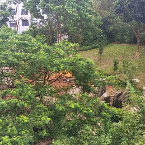 其次,從今年7月起,在二層架高平臺(tái)之上的山坡綠地,存在樹木砍伐和綠地草坪遭毀壞的情況,且有挖掘機(jī)開入并停泊,而現(xiàn)場(chǎng)也沒有任何工程信息和告示。