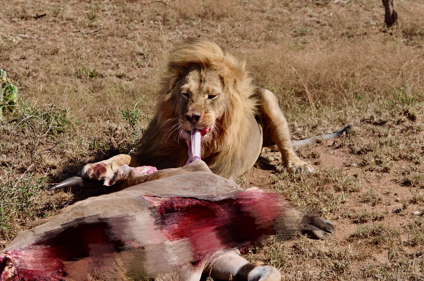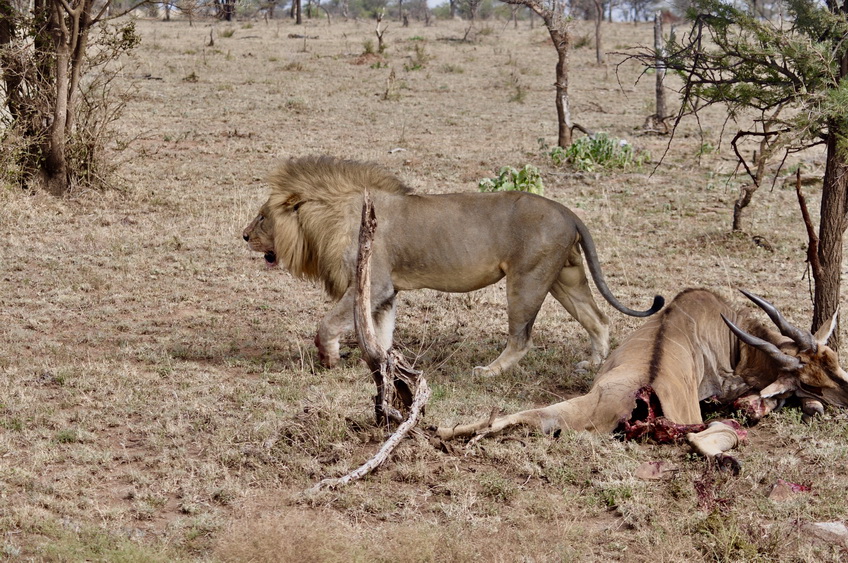 作者運(yùn)氣不錯(cuò),在塞倫蓋蒂巡游時(shí)巧遇一頭雄獅守護(hù)在一頭被咬死的大羚羊旁。李仁奇 攝