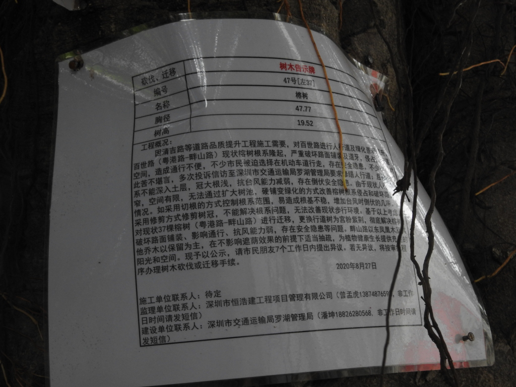 9月6日,有網(wǎng)民在深圳論壇發(fā)帖《深圳版的指鹿為馬,蓮塘為了砍樹,不是榕樹硬說是榕樹》反映,稱“百世路邊大樹貼上一張張紙條,大意是這些榕樹根系發(fā)達,破壞人行道、路牙和機動車路面,為了精準提升,所以要移除砍掉!仔細看看,這些行道樹根本就不是榕樹,而且沒有損壞道路路面,至于路邊的人行道,是這兩年才修建有的,之前屬于路邊綠化帶,種花草?!笔嗄陙頉]有一棵樹被臺風吹倒!該網(wǎng)友稱影響該路段市民出行另有原因,“至于市民被迫在機動車道上行走,那是道路的兩邊停滿了機動車,很多都是僵尸車,沒人管。”