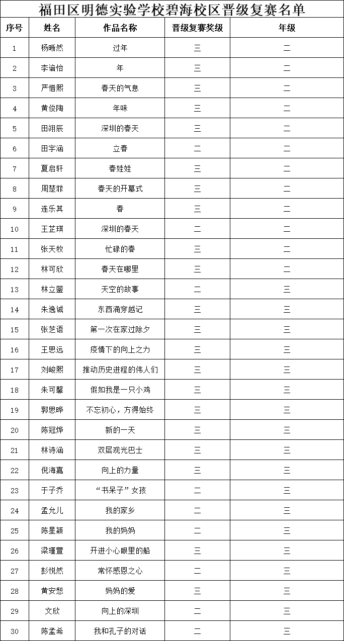 自2021年1月,活動征稿啟動以來,獲得了深圳市廣大中小學生、教師、文學愛好者的熱烈響應積極參與,吸引了深圳百余所學校的上萬人關注報名?,F(xiàn)公布福田區(qū)明德實驗學校碧海校區(qū)專場晉級復賽名單如下: