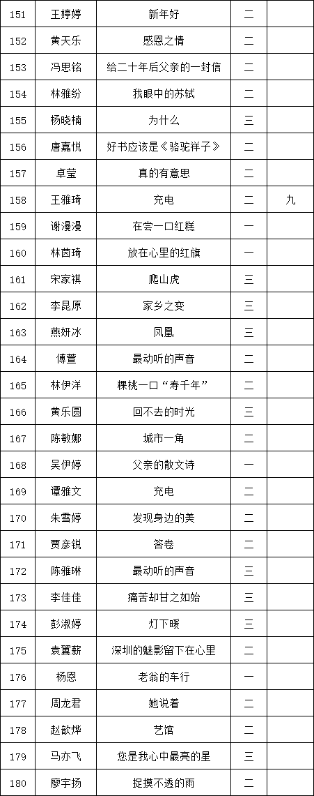 自2021年1月,活動征稿啟動以來,獲得了深圳市廣大中小學(xué)生、教師、文學(xué)愛好者的熱烈響應(yīng)積極參與,吸引了深圳百余所學(xué)校的上萬人關(guān)注報名?,F(xiàn)公布福田區(qū)梅山中學(xué)晉級復(fù)賽名單如下: