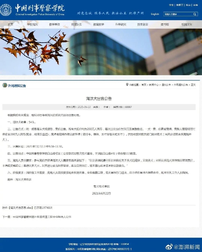 6月22日,中國(guó)刑警學(xué)院發(fā)布了一則淘汰犬出售公告。