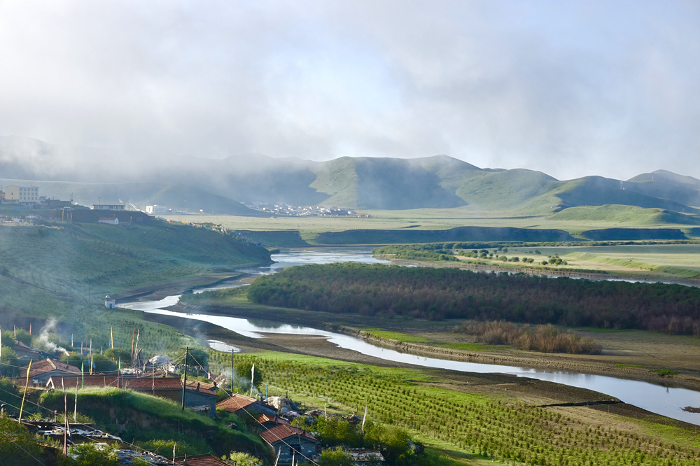 黃河的這一段流程是四川與甘肅的界河,河西為甘肅,河?xùn)|為四川。黃河自甘肅一側(cè)來(lái),白河自黃河第一灣灣頂匯入,型如“S”型,黃河之水猶如仙女的飄帶從天邊緩緩飄來(lái),在四川邊上輕輕撫了一下又轉(zhuǎn)身飄回青海,故此地稱九曲黃河第一灣。李仁奇 攝