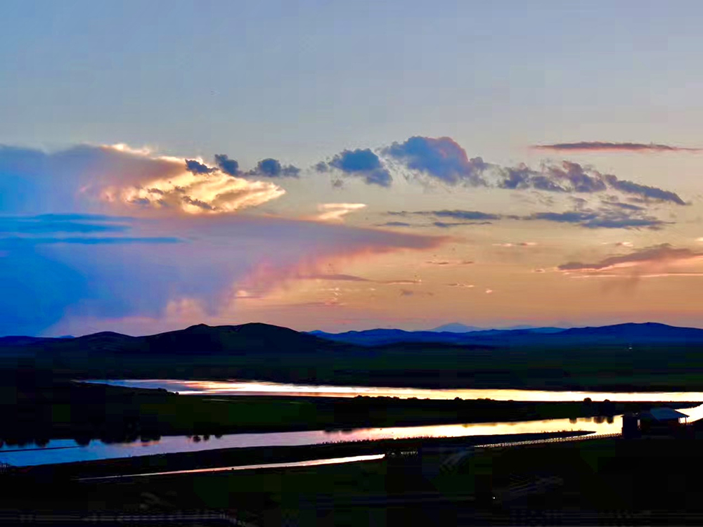 日落時(shí)分,空中的云不再是白色的,而是像披上了一件橘紅色的衣衫,漂浮在空中,平靜柔美的河水也鍍上了一層金黃色的光暈?!熬徘S河第一灣”,果然名不虛傳。李仁奇 攝