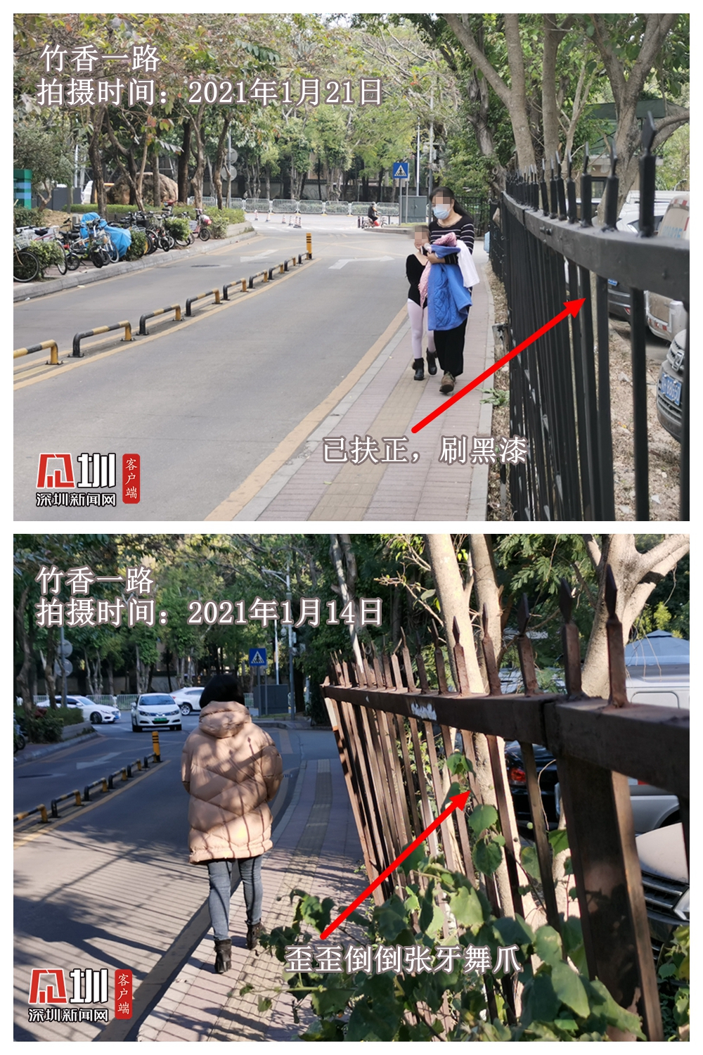 記者在竹香一路看到,原本向外傾斜的圍欄已經(jīng)全部扶正加固,且重新噴上黑色新漆,看起來整齊了許多,通行體驗較之前更好。“現(xiàn)在弄得不錯,比之前牢固很多,向外的尖尖也都弄整齊了”家住附近的王先生說。