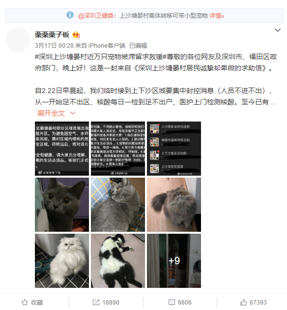 讀特客戶端·深圳新聞網(wǎng)2022年3月18日訊(記者 戰(zhàn)旗 陳蘇雅 劉詩(shī)瑾)3月16日,博主“栗栗栗子板”發(fā)布的一條微博沖上微博熱搜,深圳上沙塘晏村轉(zhuǎn)移的事件也被市民熱議,其中寵物去向的話題更是引發(fā)了人們的關(guān)注。