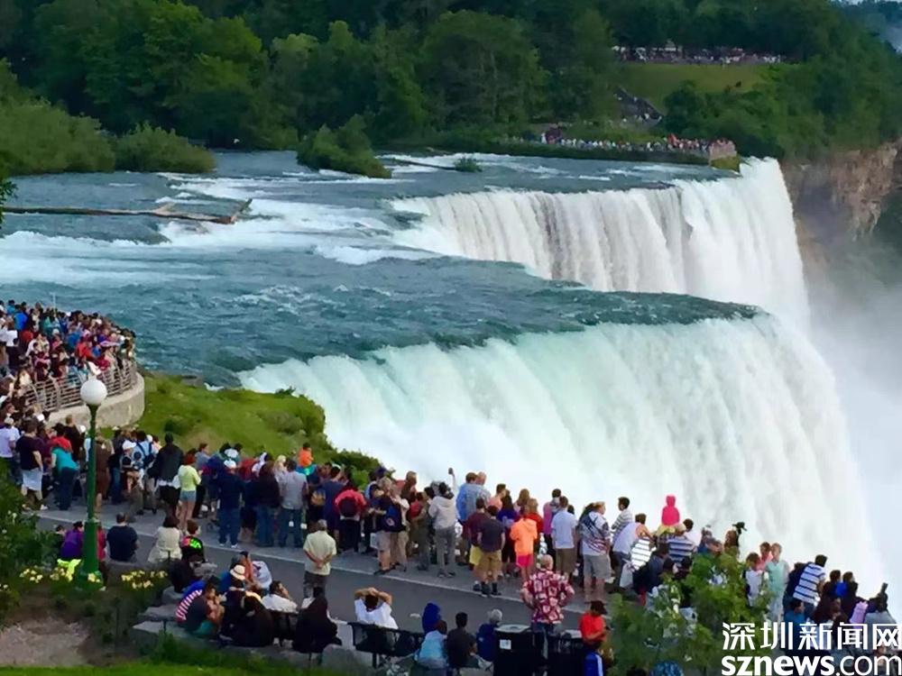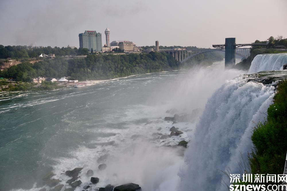 從加拿大這邊的觀(guān)景臺(tái)和河岸的維多利亞皇后公園可以看到尼亞加拉瀑布?jí)邀惖娜埃绹?guó)的瀑布城則只能看到局部。李仁奇 攝