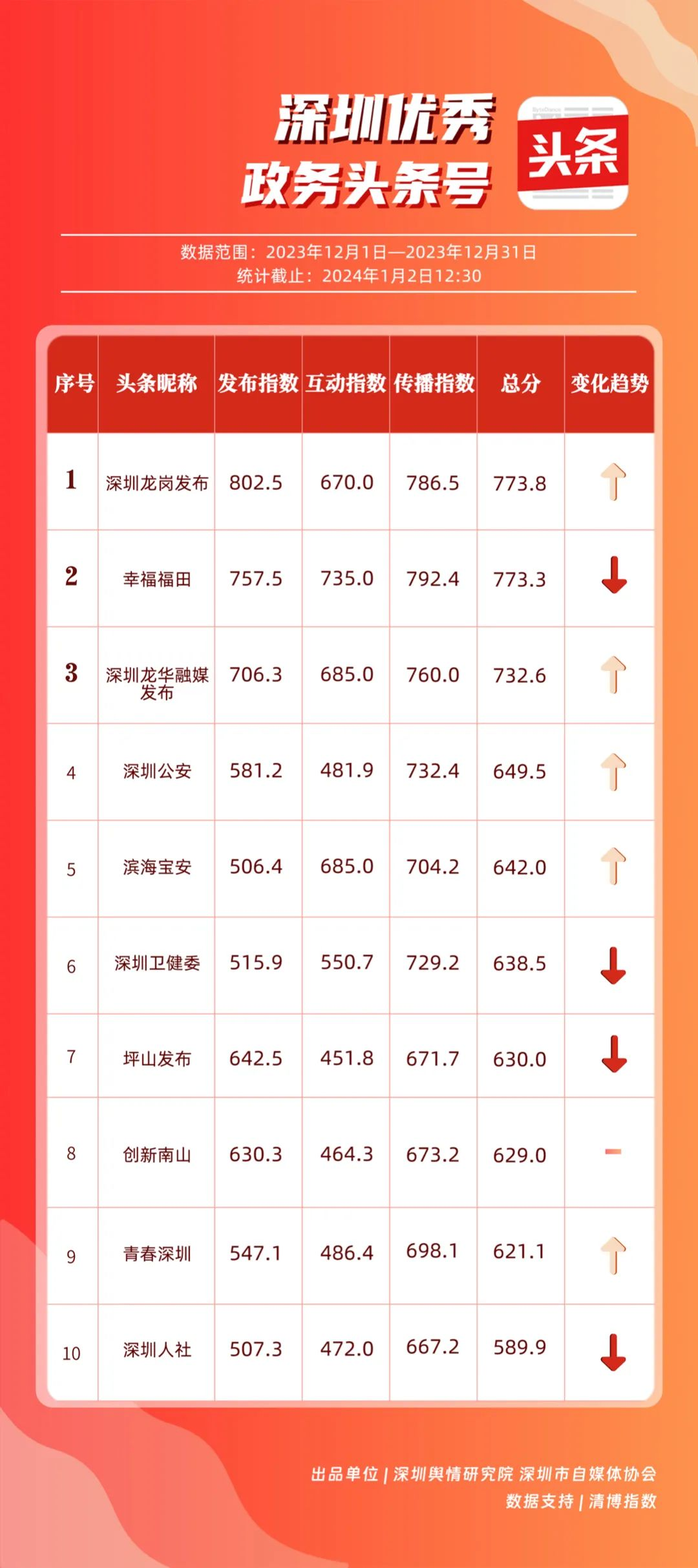 深圳新聞網(wǎng)1月16日訊(記者 陳曉君 實習生 張馳)2024年1月15日,《深圳優(yōu)秀政務(wù)新媒體矩陣》(2023年12月期)正式發(fā)布,共有10個新媒體矩陣被評為“優(yōu)秀”,分別是市氣象局、市衛(wèi)生健康委、龍崗區(qū)、福田區(qū)、龍華區(qū)、光明區(qū)、市應急管理局、寶安區(qū)、羅湖區(qū)、市市場監(jiān)督管理局。上述優(yōu)秀矩陣在內(nèi)容質(zhì)量、更新頻率、粉絲互動等方面穩(wěn)定性較高,獲得公眾的關(guān)注與支持。