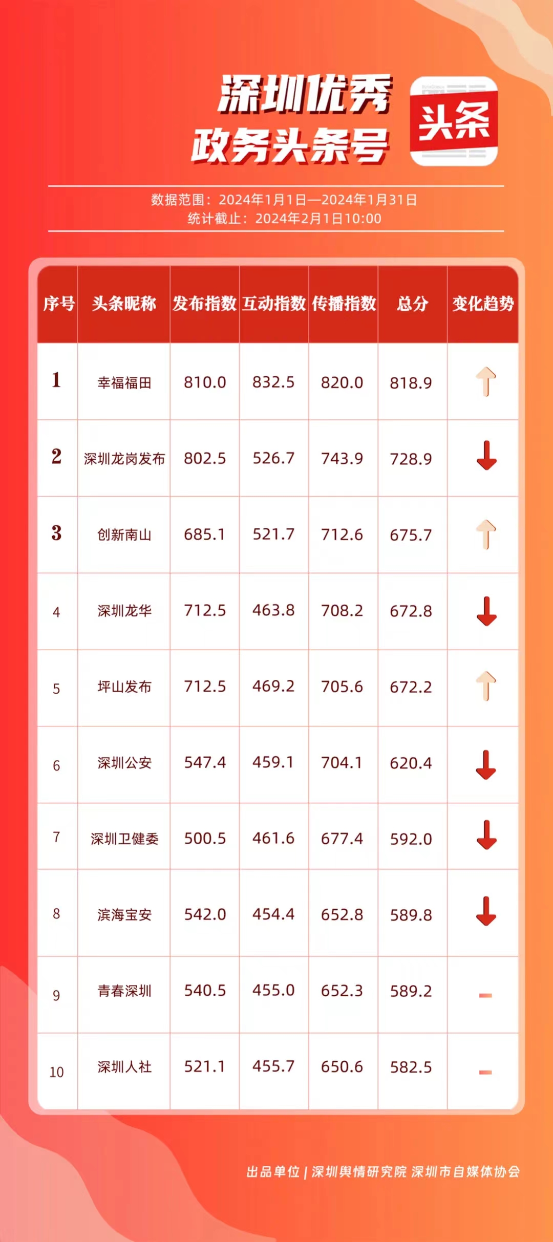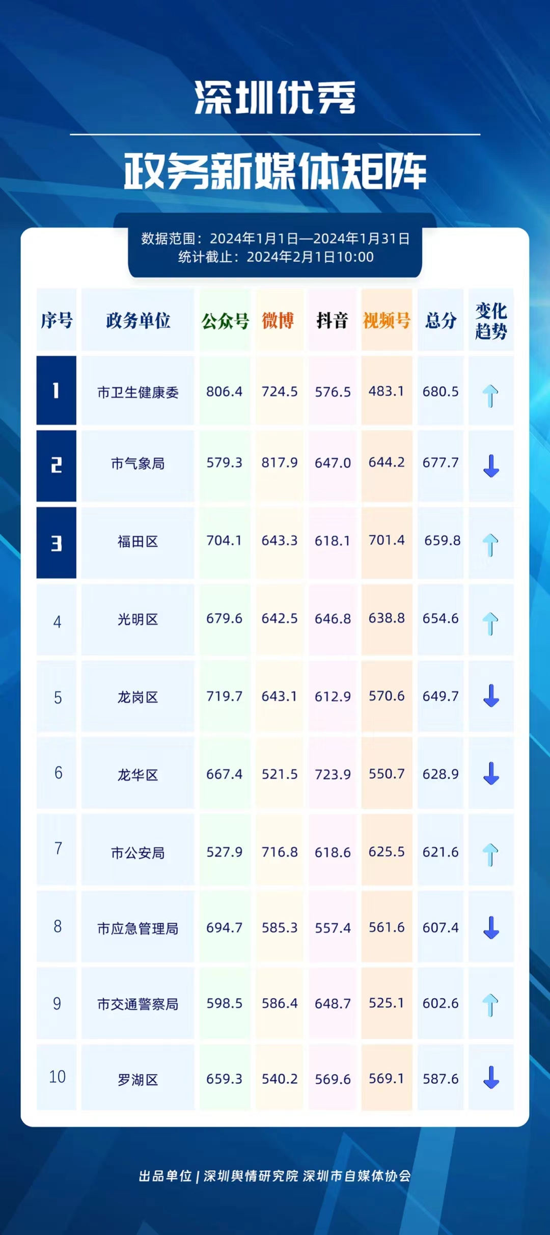 深圳新聞網(wǎng)2月9日訊(記者 陳曉君 實習生 張馳)2月8日,深圳輿情研究院、深圳市自媒體協(xié)會聯(lián)合推出《深圳優(yōu)秀政務新媒體矩陣》(2024年1月期),市衛(wèi)生健康委、市氣象局、福田區(qū)、光明區(qū)、龍崗區(qū)、龍華區(qū)、市公安局、市應急管理局、市交通警察局、羅湖區(qū)的新媒體矩陣獲評“深圳優(yōu)秀政務新媒體矩陣”。這些矩陣在內容發(fā)布、受眾互動和信息傳播方面取得了較好成績,并在深圳政務新媒體規(guī)范有序發(fā)展進程中發(fā)揮著積極作用。