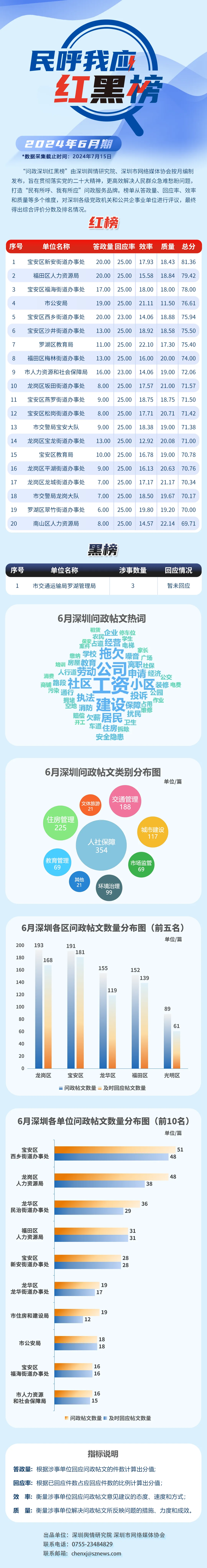 2024年6月,共有20家單位因積極解決民生問題,認(rèn)真細(xì)致答政,登上“紅榜”,它們分別是:寶安區(qū)新安街道辦事處、福田區(qū)人力資源局、寶安區(qū)福海街道辦事處、市公安局、寶安區(qū)西鄉(xiāng)街道辦事處、寶安區(qū)沙井街道辦事處、羅湖區(qū)教育局、福田區(qū)梅林街道辦事處、市人力資源和社會保障局、龍崗區(qū)坂田街道辦事處、寶安區(qū)燕羅街道辦事處、寶安區(qū)松崗街道辦事處、市交警局寶安大隊(duì)、龍崗區(qū)寶龍街道辦事處、寶安區(qū)教育局、龍崗區(qū)平湖街道辦事處、龍崗區(qū)龍城街道辦事處、市交警局龍崗大隊(duì)、羅湖區(qū)翠竹街道辦事處、南山區(qū)人力資源局。另外,市交通運(yùn)輸局羅湖管理局因相關(guān)帖文回應(yīng)率偏低,整體答政效果不佳,被列入“黑榜”。