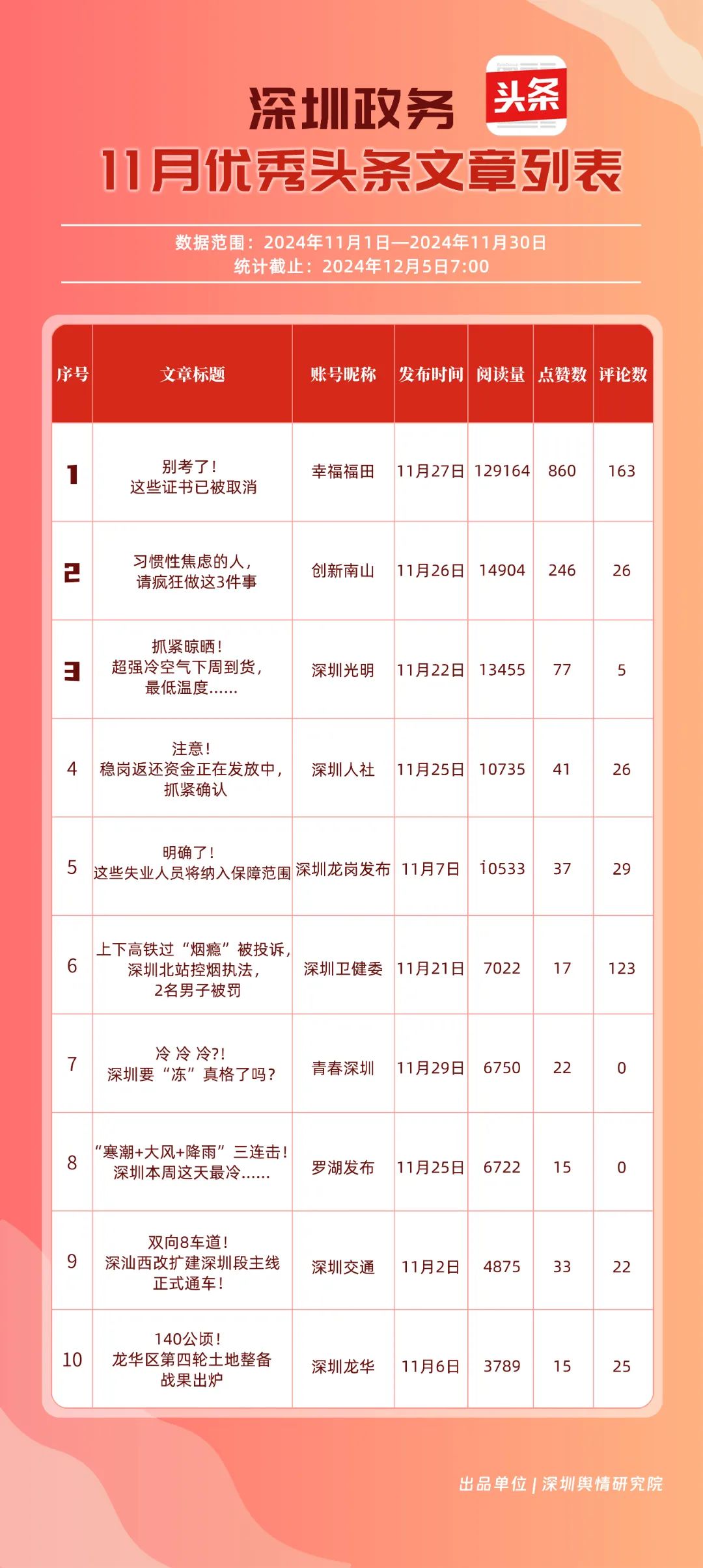 11月,“幸福福田”“深圳龍崗發(fā)布”“創(chuàng)新南山”“深圳人社”“深圳龍華”“深圳光明”“濱海寶安”“坪山發(fā)布”“深圳衛(wèi)健委”“羅湖發(fā)布”共10個政務(wù)頭條號入選“優(yōu)秀政務(wù)頭條號”榜單。“幸福福田”發(fā)布大量民生相關(guān)信息,穩(wěn)居第一?!吧钲邶垗彴l(fā)布”同樣表現(xiàn)不凡,排名始終位于前列,展現(xiàn)了其在信息傳播與政務(wù)服務(wù)方面的卓越能力。此外,賬號“創(chuàng)新南山”“深圳人社”“深圳龍華”“深圳光明”在榜單中的排名有所提升,為政務(wù)新媒體樹立了典范。
