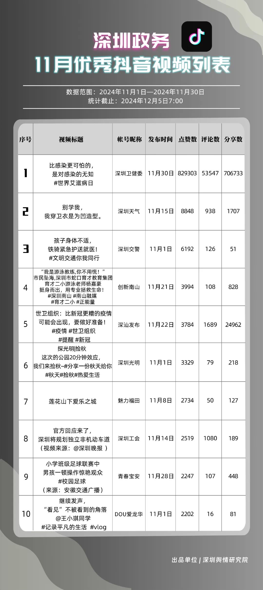 11月,“深圳衛(wèi)健委”“掌上龍崗”“深圳天氣”“深汕發(fā)布”“深圳工會”“深圳交警”“創(chuàng)新南山”“DOU愛龍華”“深圳光明”“中國前?!惫?0個政務(wù)抖音號獲得“深圳優(yōu)秀政務(wù)抖音號”稱號?!吧钲谛l(wèi)健委”憑借高質(zhì)量劇情內(nèi)容,巧妙融入健康知識,視頻累計收獲近百萬點贊。同時,“掌上龍崗”和“深圳天氣”也在視頻內(nèi)容創(chuàng)新上不斷探索,通過優(yōu)化宣傳策略和信息傳播方式,使得網(wǎng)民能夠在輕松愉快的氛圍中了解龍崗區(qū)的最新動態(tài)和深圳的天氣信息,展現(xiàn)了政務(wù)抖音號的獨特魅力與社會影響力。