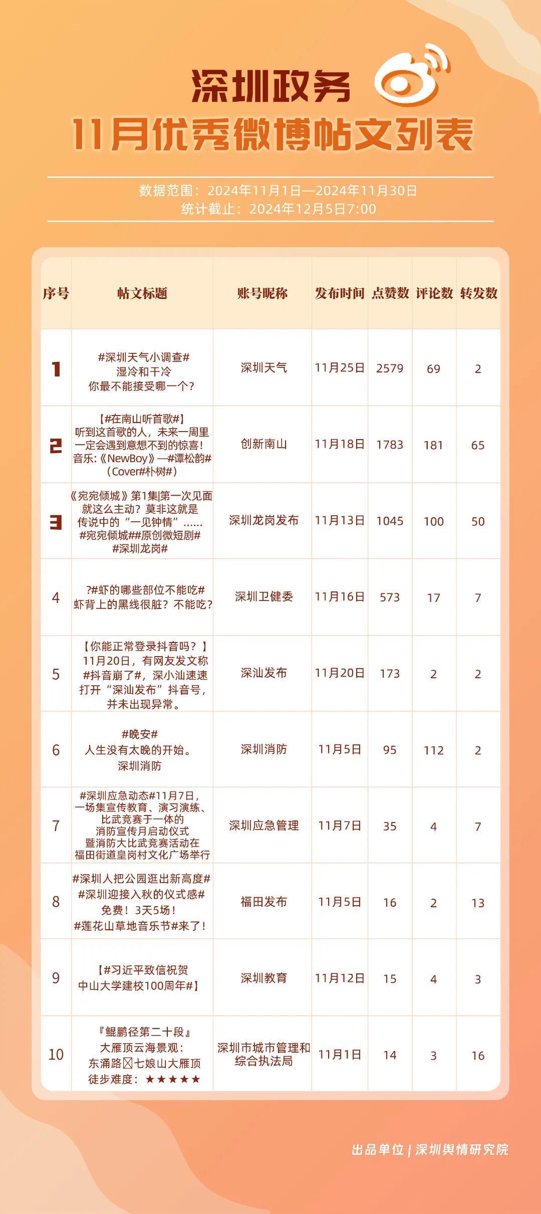 11月,“深圳天氣”“深圳衛(wèi)健委”“深圳龍崗發(fā)布”“深圳消防”“創(chuàng)新南山”“深圳應(yīng)急管理”“深圳公安”“深圳市城市管理和綜合執(zhí)法局”“福田發(fā)布”“深圳交警”等20個賬號入選“優(yōu)秀政務(wù)微博號”。“深圳天氣”“深圳衛(wèi)健委”賬號在信息傳播上不斷精進(jìn),為市民帶來及時、優(yōu)質(zhì)且高效的資訊,內(nèi)容緊貼民生,贏得了市民的廣泛贊譽(yù),排名穩(wěn)定在前2名。同時,“深圳龍崗發(fā)布”“深圳消防”和“創(chuàng)新南山”等賬號也能夠精準(zhǔn)滿足市民的信息需求,并在此基礎(chǔ)上提升市民閱讀體驗,推動了其在榜單上的穩(wěn)步提升,彰顯了政務(wù)微博的創(chuàng)新活力與社會價值。