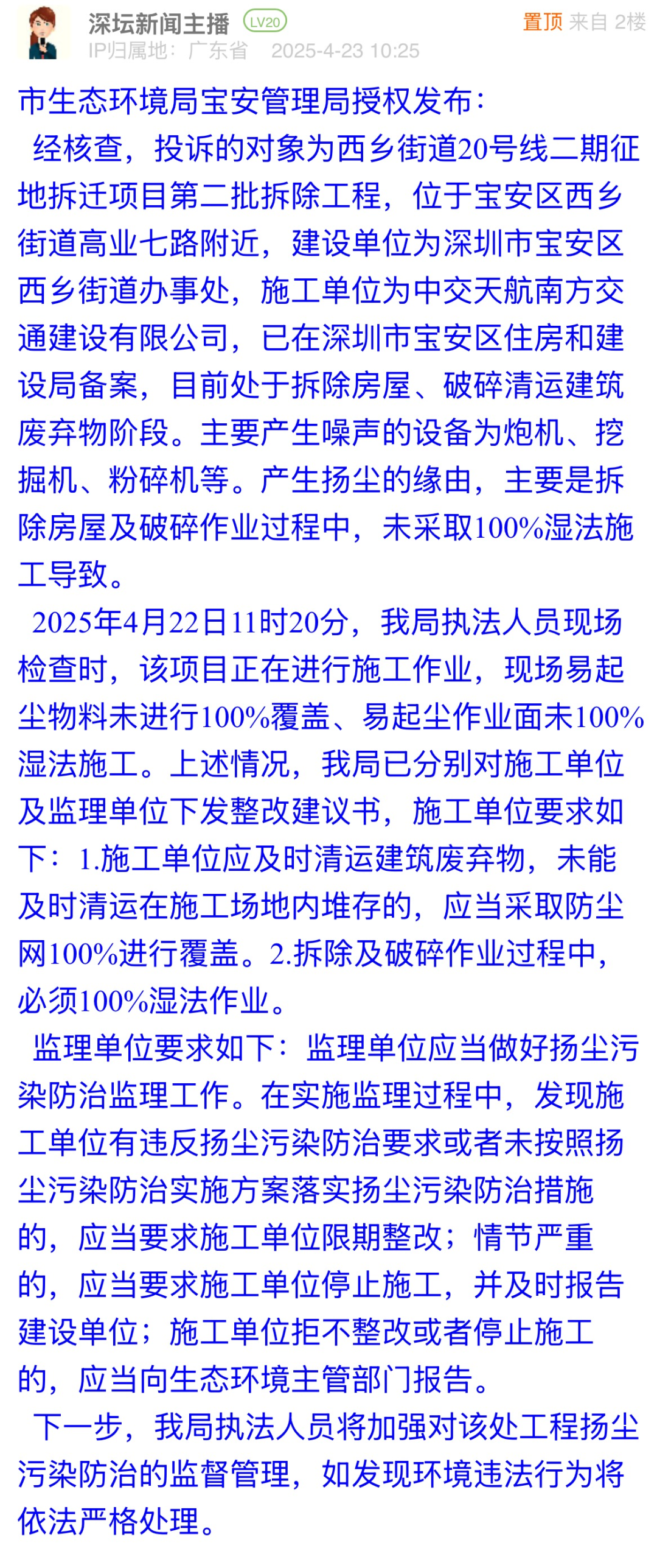 市民反映工地未落實降塵措施問題,直接關(guān)乎周邊環(huán)境質(zhì)量,生態(tài)環(huán)境局寶安管理局快速響應(yīng),第一時間核查鎖定責(zé)任主體,明確施工與監(jiān)理單位整改要求,回應(yīng)既及時又切中要害。從問題反饋到措施落地的全流程,體現(xiàn)了該局對市民訴求的高度重視,更展現(xiàn)出生態(tài)監(jiān)管部門“民有所呼、立行立改”的責(zé)任擔(dān)當(dāng),切實守護(hù)市民的呼吸安全。