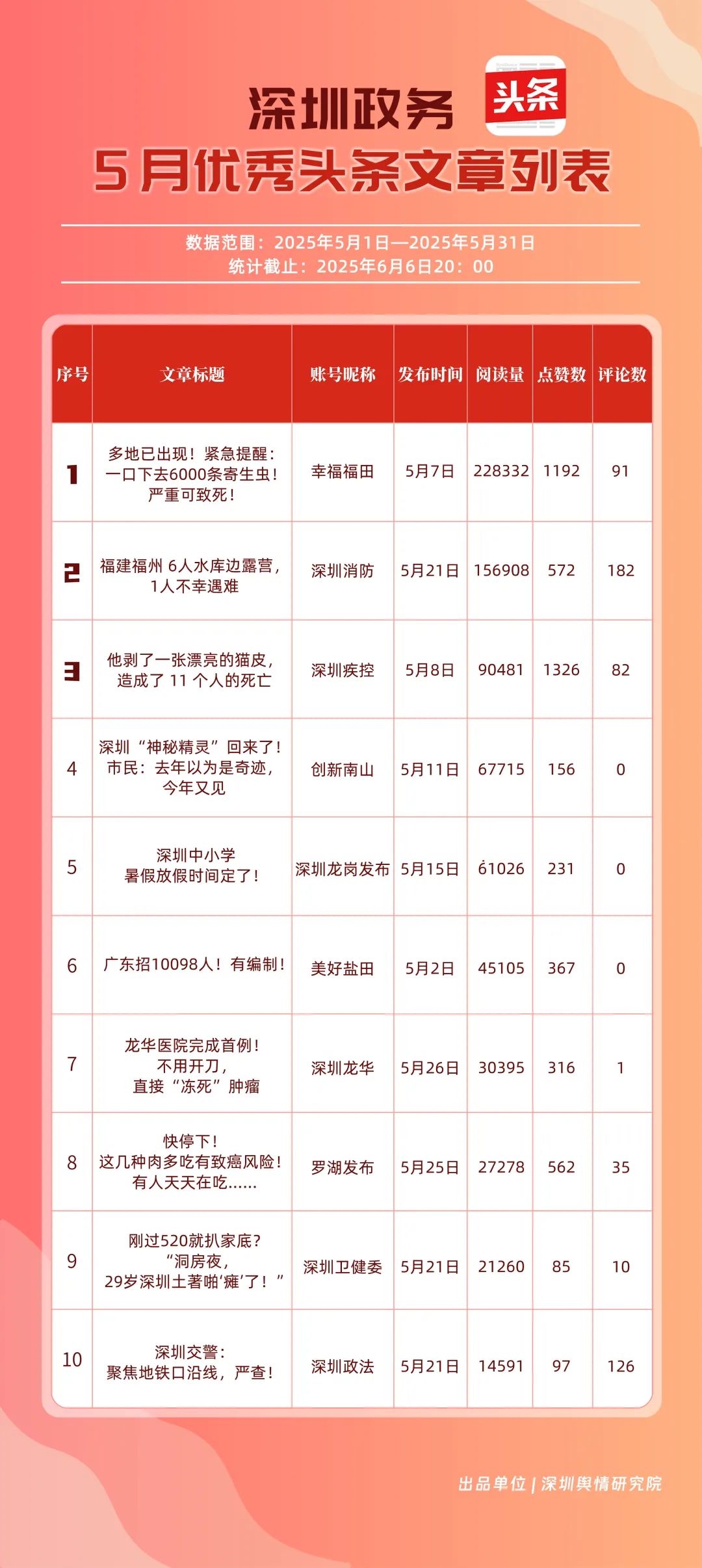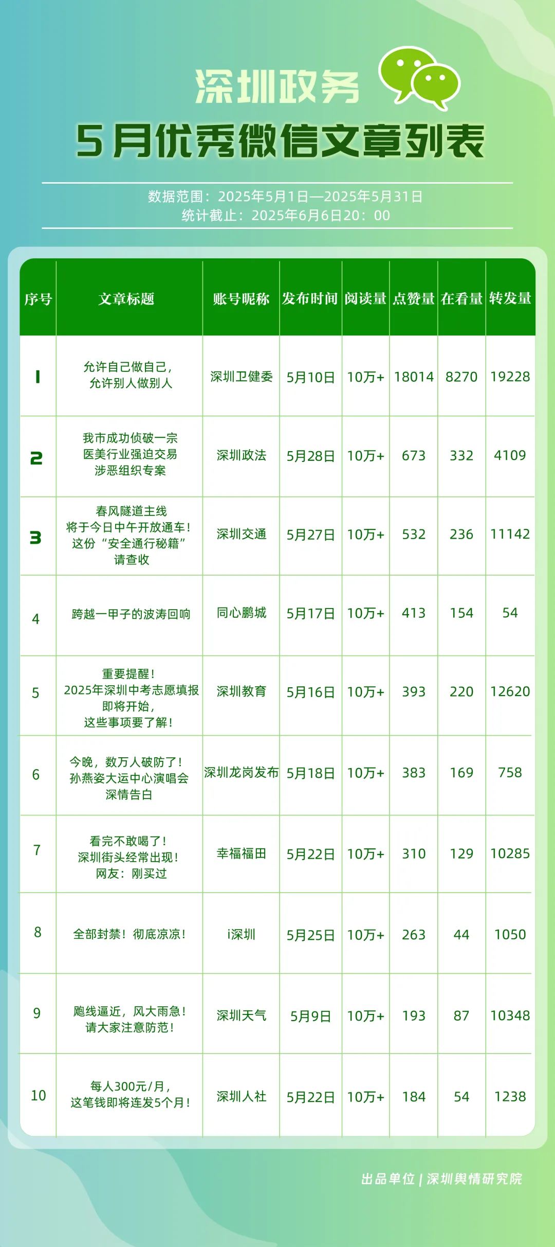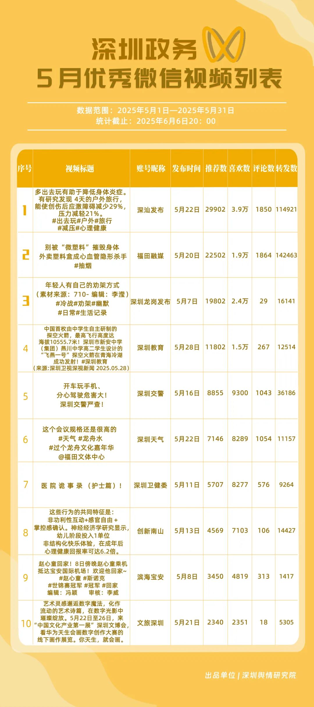 5月,“幸福福田”“深圳消防”“創(chuàng)新南山”“深圳疾控”“羅湖發(fā)布”“深圳龍崗發(fā)布”“坪山發(fā)布”“青春深圳”“深圳龍華”“深圳人社”共10個政務頭條號入選“優(yōu)秀政務頭條號”榜單。在榜單前三名中,“幸福福田”“創(chuàng)新南山”以穩(wěn)定且高質(zhì)量的內(nèi)容輸出,持續(xù)領跑,排名較上個月未發(fā)生變動。位居榜單第二的“深圳消防”同樣表現(xiàn)亮眼,排名較上個月提升2個名次,充分展現(xiàn)了其在消防安全宣傳領域的持續(xù)深耕和創(chuàng)新突破。上榜政務頭條號各展所長,以優(yōu)質(zhì)內(nèi)容為核心,充分發(fā)揮平臺傳播優(yōu)勢,為政務信息的高效觸達與廣泛傳播樹立了標桿。