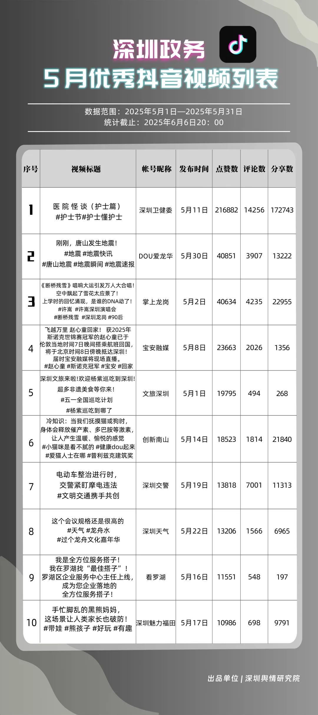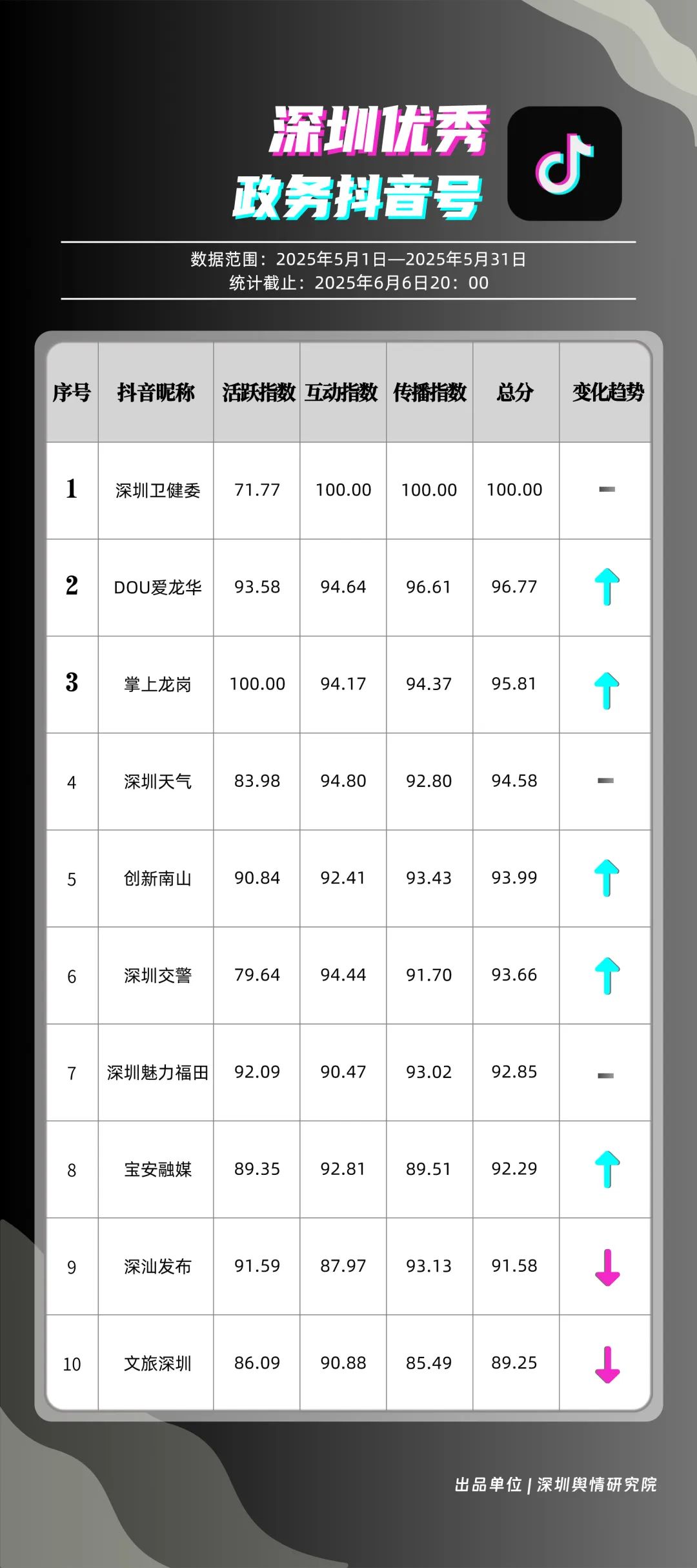 5月,“深圳衛(wèi)健委”“DOU愛龍華”“掌上龍崗”“深圳天氣”“創(chuàng)新南山”“深圳交警”“深圳魅力福田”“寶安融媒”“深汕發(fā)布”“文旅深圳”共10個政務抖音號獲得“優(yōu)秀政務抖音號”稱號。5月,“深圳衛(wèi)健委”憑借3條極具創(chuàng)意的視頻內(nèi)容持續(xù)收獲網(wǎng)民關(guān)注,穩(wěn)居榜首之位,成為政務抖音號領域的標桿?!癉OU愛龍華”“掌上龍崗”較上個月排名大幅度上升,以96.77分和95.81分位居榜單第2、3名,彰顯出積極探索創(chuàng)新傳播路徑、開拓政務短視頻發(fā)展新可能的決心。以上優(yōu)秀政務抖音號通過多樣化的短視頻形式傳遞政務資訊,為深圳政務新媒體在短視頻領域的蓬勃發(fā)展注入強勁動能,成為政務信息傳播的新標桿。