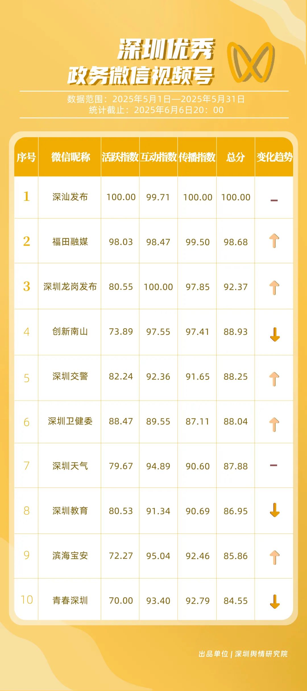 《深圳優(yōu)秀政務新媒體矩陣》將深圳黨政機關(guān)、企事業(yè)單位開設的政務公眾號(微信)、微博號、抖音號、視頻號(微信)及頭條號按照活躍指數(shù)、互動指數(shù)、傳播指數(shù)三項指標進行綜合評價,最終形成優(yōu)秀名單。