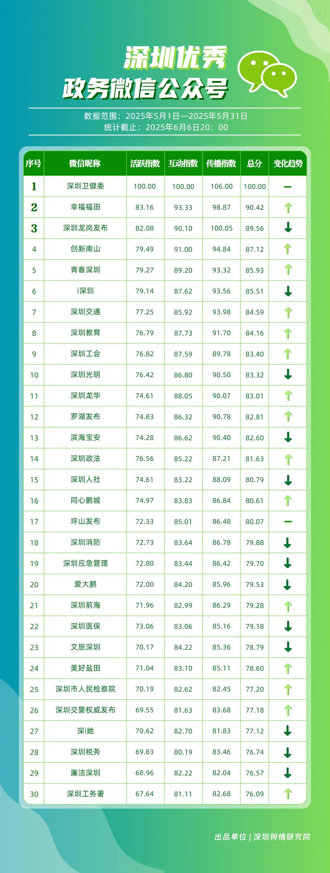 5月,30個政務微信公眾號入選“深圳優(yōu)秀政務微信公眾號”榜單,其中包括“深圳衛(wèi)健委”“幸福福田”“深圳龍崗發(fā)布”“創(chuàng)新南山”“青春深圳”“i深圳”“深圳交通”“深圳教育”“深圳工會”“深圳光明”等。其中,“深圳衛(wèi)健委”在活躍、互動、傳播3項指標上獲得滿分,其亮眼數(shù)據(jù)彰顯了內(nèi)容創(chuàng)作的高質(zhì)量,位居榜單首位。“幸福福田”同樣表現(xiàn)出色,排名較上個月有所上升,以總分90.42的優(yōu)異成績位居榜單第2名;“深圳龍崗發(fā)布”“創(chuàng)新南山”“青春深圳”緊隨其后,以新穎的互動形式吸引用戶參與,表現(xiàn)值得肯定。上榜賬號充分發(fā)揮微信公眾平臺的傳播優(yōu)勢,以豐富多元的內(nèi)容形態(tài)、生動鮮活的表達風格,持續(xù)為市民提供優(yōu)質(zhì)的信息服務。