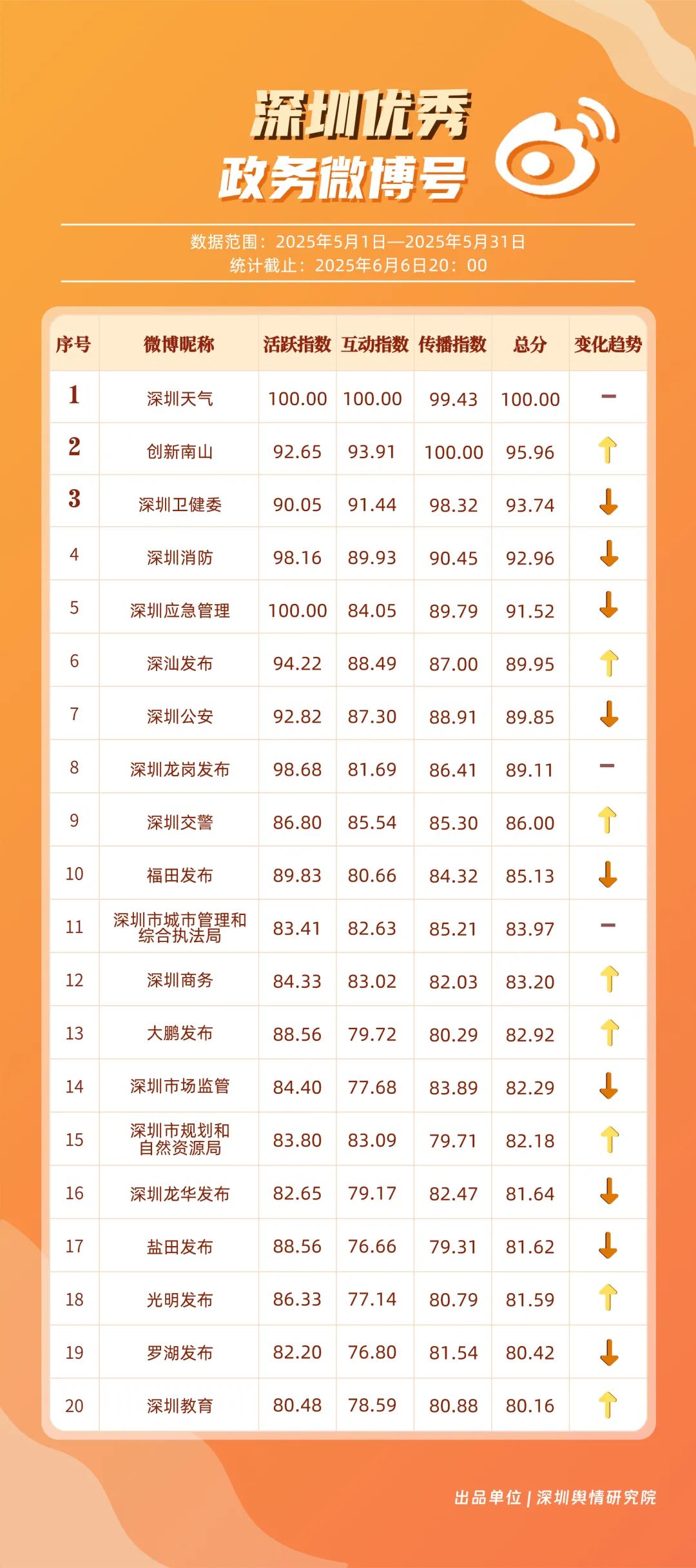 5月,“深圳天氣”“創(chuàng)新南山”“深圳衛(wèi)健委”“深圳消防”“深圳應急管理”“深汕發(fā)布”“深圳公安”“深圳龍崗發(fā)布”“深圳交警”“福田發(fā)布”等20個賬號入選“優(yōu)秀政務微博號”。其中,“深圳天氣”憑借活躍指數(shù)和互動指數(shù)雙項滿分的亮眼成績,穩(wěn)居榜單首位?!皠?chuàng)新南山”以95.96分緊隨其后,在互動、傳播指數(shù)得分大幅提升,排名實現(xiàn)顯著躍升。“深圳衛(wèi)健委”“深圳消防”“深圳應急管理”也表現(xiàn)卓越,總分均超過90分,它們憑借權(quán)威信息發(fā)布、專業(yè)知識科普,展現(xiàn)了各單位在民生服務、公共安全領域的重要作用。以上優(yōu)秀政務微博號深度契合平臺的傳播特征,善于借助熱門話題擴大影響力,以鮮明的賬號特色展現(xiàn)區(qū)域風采。
