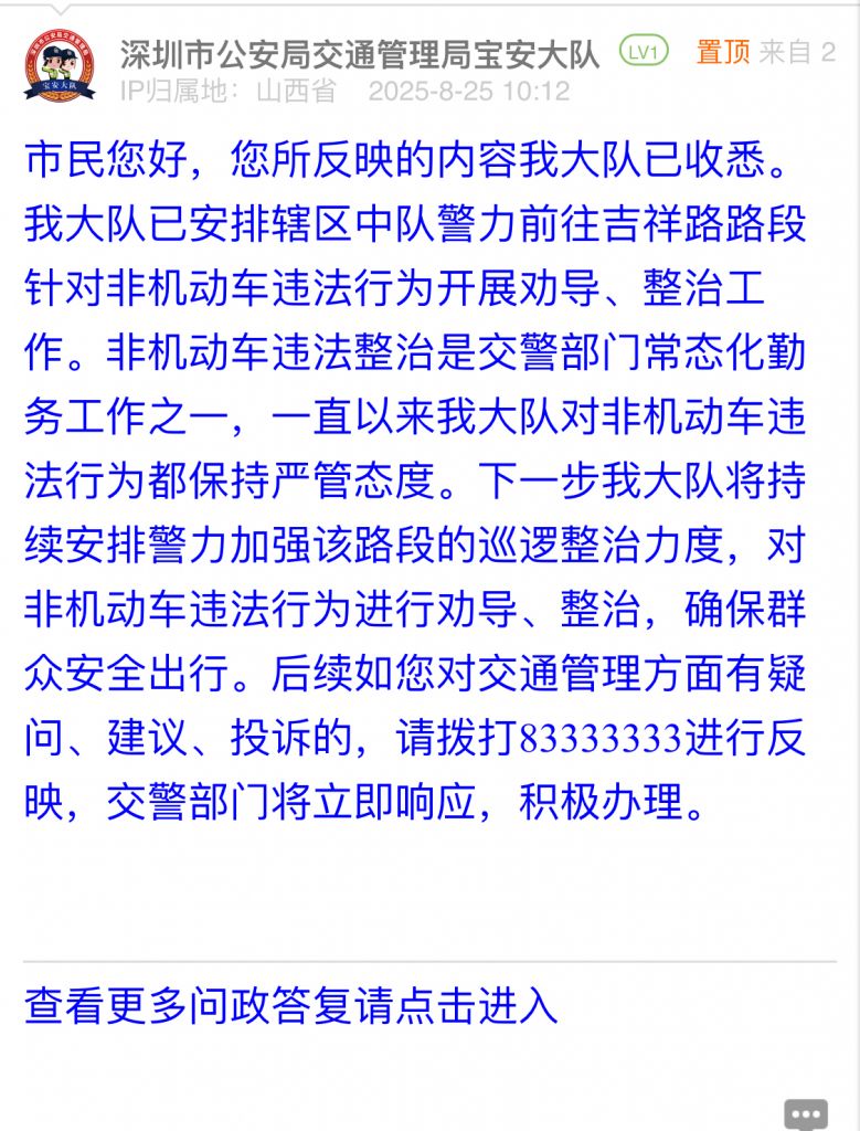 市民您好,您所反映的內容我大隊已收悉。我大隊已安排轄區(qū)中隊警力前往吉祥路路段針對非機動車違法行為開展勸導、整治工作。非機動車違法整治是交警部門常態(tài)化勤務工作之一,一直以來我大隊對非機動車違法行為都保持嚴管態(tài)度。下一步我大隊將持續(xù)安排警力加強該路段的巡邏整治力度,對非機動車違法行為進行勸導、整治,確保群眾安全出行。后續(xù)如您對交通管理方面有疑問、建議、投訴的,請撥打83333333進行反映,交警部門將立即響應,積極辦理。