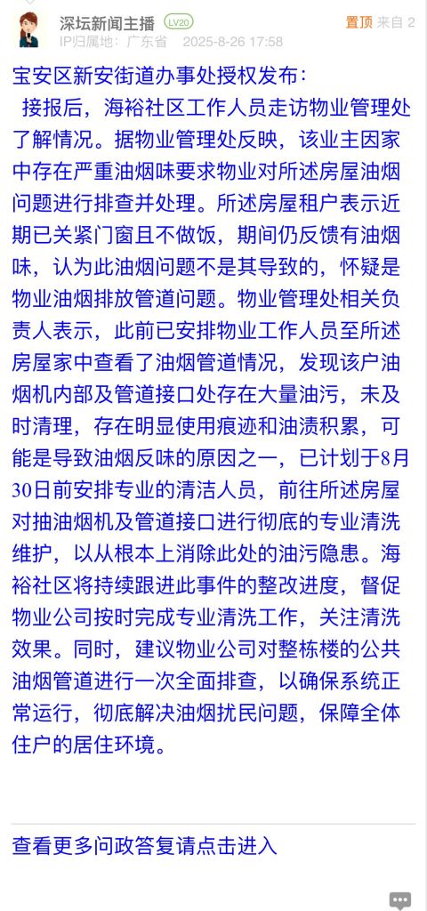 接報后,海裕社區(qū)工作人員走訪物業(yè)管理處了解情況。據物業(yè)管理處反映,該業(yè)主因家中存在嚴重油煙味要求物業(yè)對所述房屋油煙問題進行排查并處理。所述房屋租戶表示近期已關緊門窗且不做飯,期間仍反饋有油煙味,認為此油煙問題不是其導致的,懷疑是物業(yè)油煙排放管道問題。物業(yè)管理處相關負責人表示,此前已安排物業(yè)工作人員至所述房屋家中查看了油煙管道情況,發(fā)現(xiàn)該戶油煙機內部及管道接口處存在大量油污,未及時清理,存在明顯使用痕跡和油漬積累,可能是導致油煙反味的原因之一,已計劃于8月30日前安排專業(yè)的清潔人員,前往所述房屋對抽油煙機及管道接口進行徹底的專業(yè)清洗維護,以從根本上消除此處的油污隱患。海裕社區(qū)將持續(xù)跟進此事件的整改進度,督促物業(yè)公司按時完成專業(yè)清洗工作,關注清洗效果。同時,建議物業(yè)公司對整棟樓的公共油煙管道進行一次全面排查,以確保系統(tǒng)正常運行,徹底解決油煙擾民問題,保障全體住戶的居住環(huán)境。