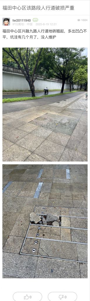 8. 帖文《福田中心區(qū)該路段人行道破損嚴重》