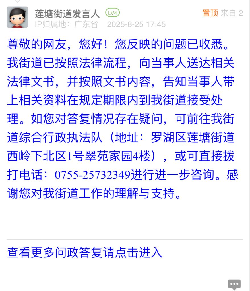 尊敬的網友,您好!您反映的問題已收悉。我街道已按照法律流程,向當事人送達相關法律文書,并按照文書內容,告知當事人帶上相關資料在規(guī)定期限內到我街道接受處理。如您對答復情況存在疑問,可前往我街道綜合行政執(zhí)法隊(地址:羅湖區(qū)蓮塘街道西嶺下北區(qū)1號翠苑家園4樓),或可直接撥打電話:0755-25732349進行進一步咨詢。感謝您對我街道工作的理解與支持。