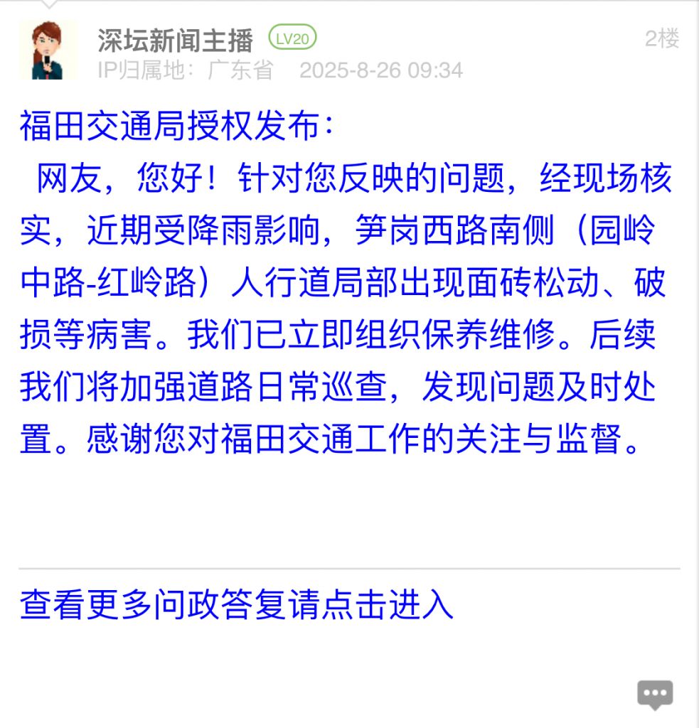 網友,您好!針對您反映的問題,經現(xiàn)場核實,近期受降雨影響,筍崗西路南側(園嶺中路-紅嶺路)人行道局部出現(xiàn)面磚松動、破損等病害。我們已立即組織保養(yǎng)維修。后續(xù)我們將加強道路日常巡查,發(fā)現(xiàn)問題及時處置。感謝您對福田交通工作的關注與監(jiān)督。