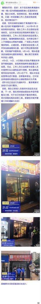 經查,您所反映的店鋪位于粵海新村7棟一樓小區(qū)內的“阿健烤鮮牛肉”。2025年8月1日收到相關線索后,我隊工作人員立即趕赴現(xiàn)場核實。當日未發(fā)現(xiàn)該店將燒烤車擺放門口經營的情況。工作人員已現(xiàn)場向該店經營人員普法,強調根據相關規(guī)定,任何單位和個人不得擅自占用城市道路、廣場等公共場所堆放物料、占道經營。并督促該店經營人員盡快加裝油煙凈化器,減少對周邊居民的影響,切實維護鄰里和諧。8月14日,我隊檢查該店油煙凈化器安裝情況,確認其已安裝完畢并投入使用。