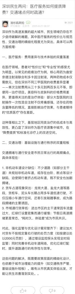 15. 帖文《深圳民生兩問:醫(yī)療服務如何提質降費?交通堵點何時疏通?》