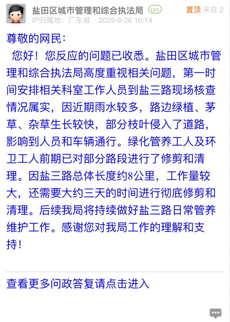 您好!您反應的問題已收悉。鹽田區(qū)城市管理和綜合執(zhí)法局高度重視相關問題,第一時間安排相關科室工作人員到鹽三路現(xiàn)場核查情況屬實,因近期雨水較多,路邊綠植、茅草、雜草生長較快,部分枝葉侵入了道路,影響到人員和車輛通行。綠化管養(yǎng)工人及環(huán)衛(wèi)工人前期已對部分路段進行了修剪和清理。因鹽三路總體長度約8公里,工作量較大,還需要大約三天的時間進行徹底修剪和清理。后續(xù)我局將持續(xù)做好鹽三路日常管養(yǎng)維護工作。感謝您對我局工作的理解和支持!