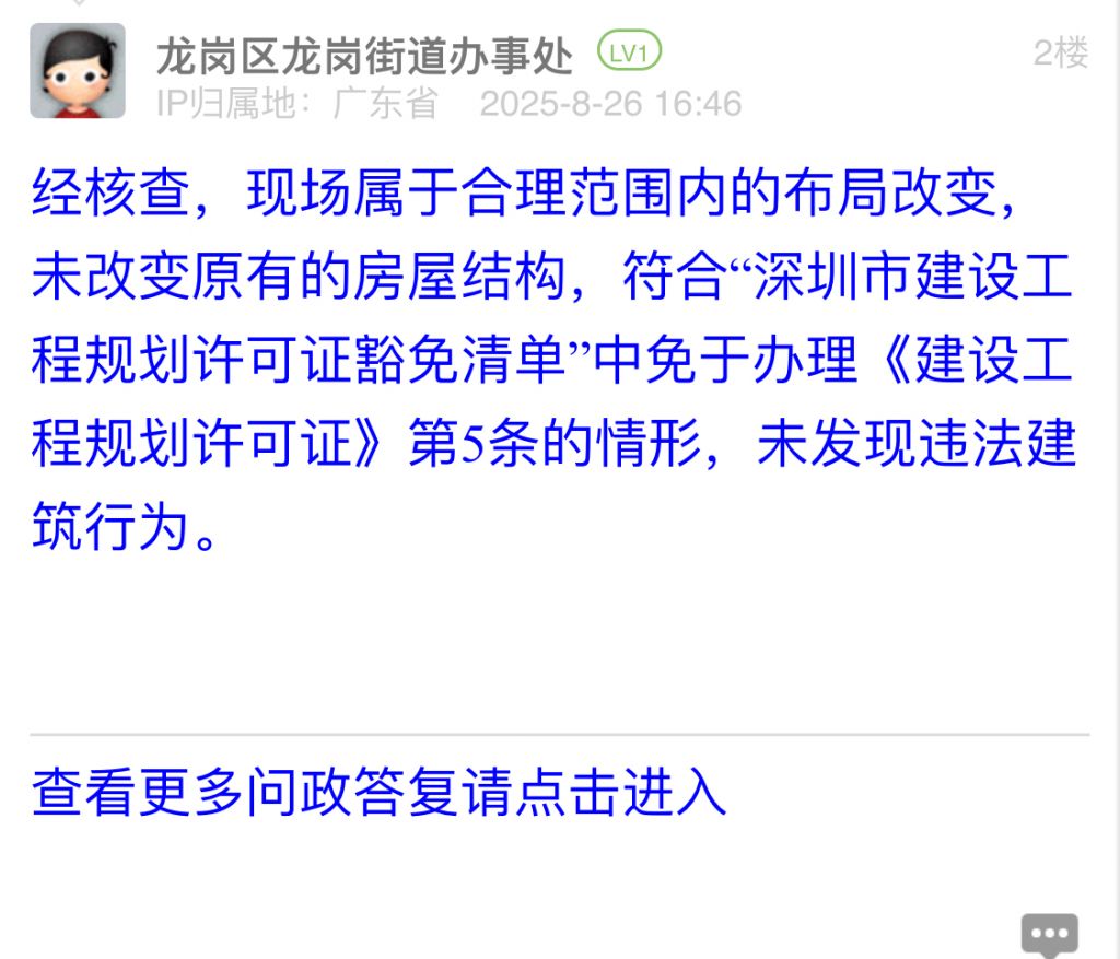 經核查,現(xiàn)場屬于合理范圍內的布局改變,未改變原有的房屋結構,符合“深圳市建設工程規(guī)劃許可證豁免清單”中免于辦理《建設工程規(guī)劃許可證》第5條的情形,未發(fā)現(xiàn)違法建筑行為。