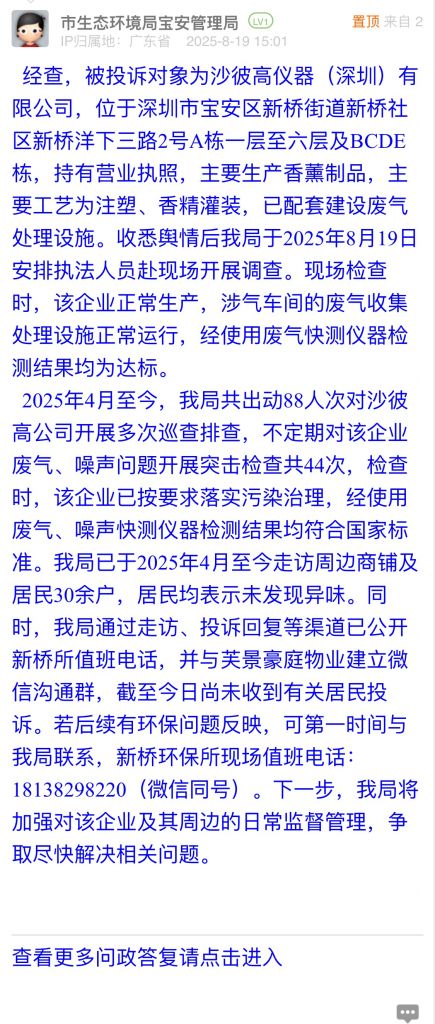 經查,被投訴對象為沙彼高儀器(深圳)有限公司,位于深圳市寶安區(qū)新橋街道新橋社區(qū)新橋洋下三路2號A棟一層至六層及BCDE棟,持有營業(yè)執(zhí)照,主要生產香薰制品,主要工藝為注塑、香精灌裝,已配套建設廢氣處理設施。收悉輿情后我局于2025年8月19日安排執(zhí)法人員赴現(xiàn)場開展調查?,F(xiàn)場檢查時,該企業(yè)正常生產,涉氣車間的廢氣收集處理設施正常運行,經使用廢氣快測儀器檢測結果均為達標。