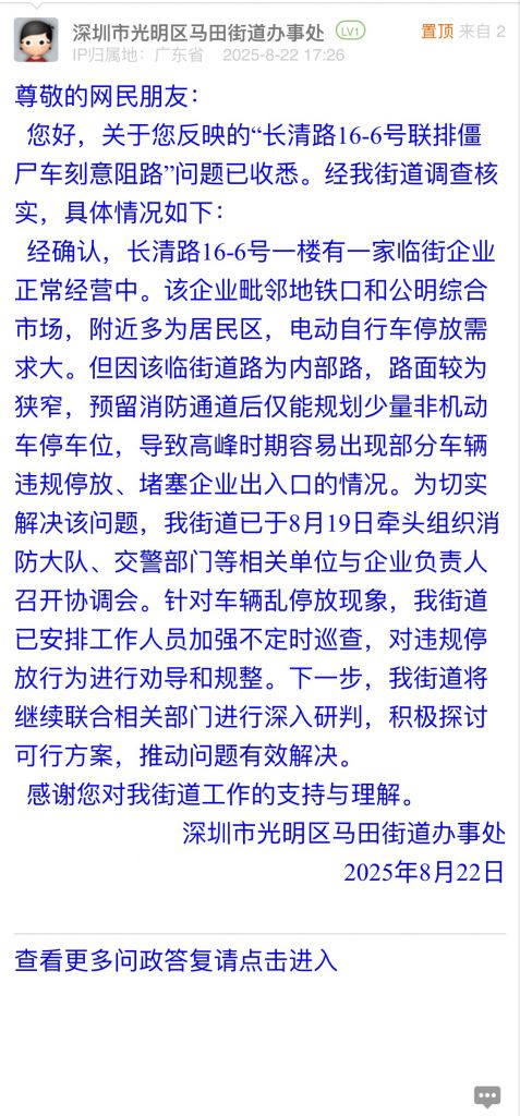 經確認,長清路16-6號一樓有一家臨街企業(yè)正常經營中。該企業(yè)毗鄰地鐵口和公明綜合市場,附近多為居民區(qū),電動自行車停放需求大。但因該臨街道路為內部路,路面較為狹窄,預留消防通道后僅能規(guī)劃少量非機動車停車位,導致高峰時期容易出現(xiàn)部分車輛違規(guī)停放、堵塞企業(yè)出入口的情況。為切實解決該問題,我街道已于8月19日牽頭組織消防大隊、交警部門等相關單位與企業(yè)負責人召開協(xié)調會。針對車輛亂停放現(xiàn)象,我街道已安排工作人員加強不定時巡查,對違規(guī)停放行為進行勸導和規(guī)整。下一步,我街道將繼續(xù)聯(lián)合相關部門進行深入研判,積極探討可行方案,推動問題有效解決。